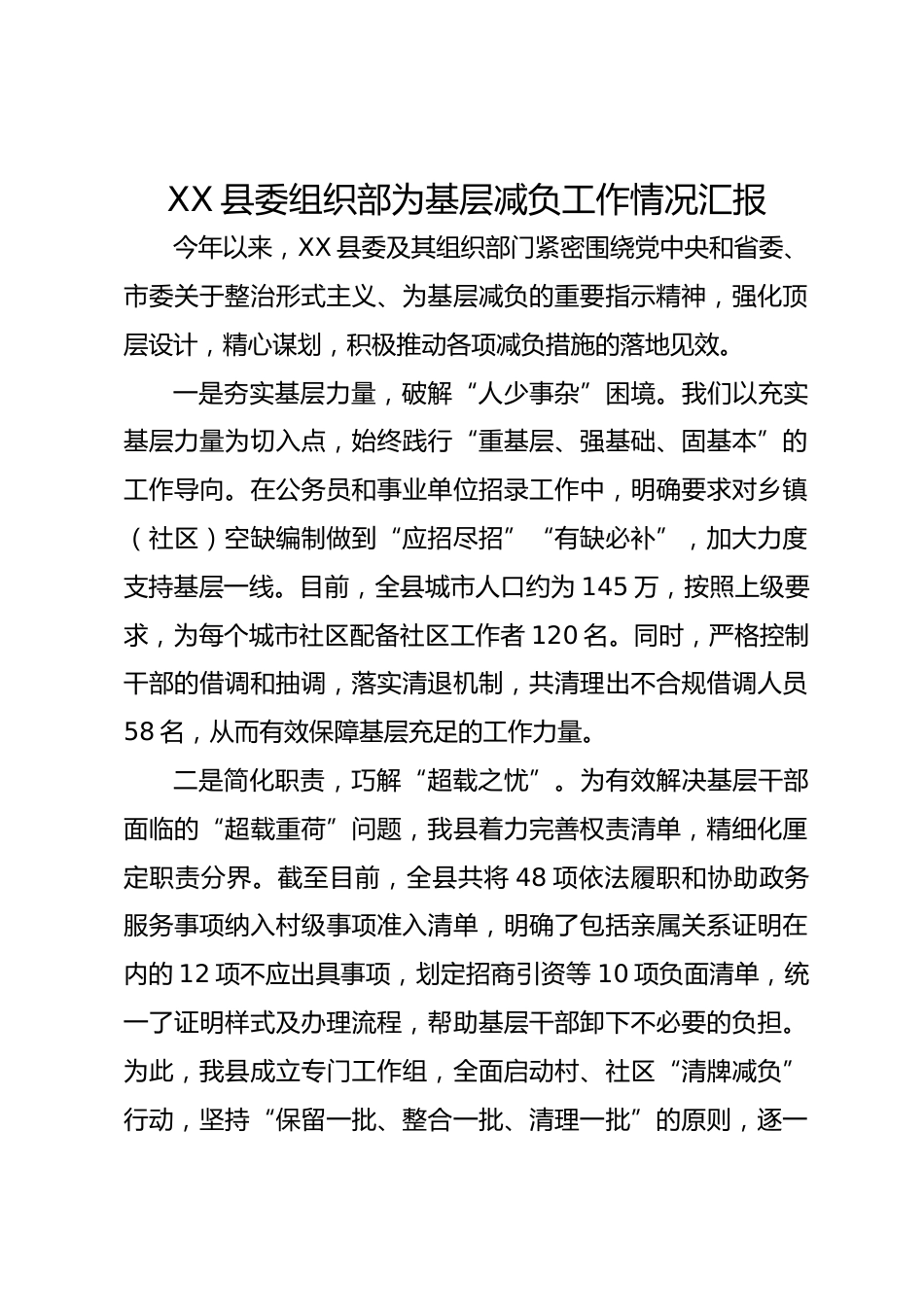 XX縣委組織部為基層減負(fù)工作情況匯報(bào)VIP免費(fèi)