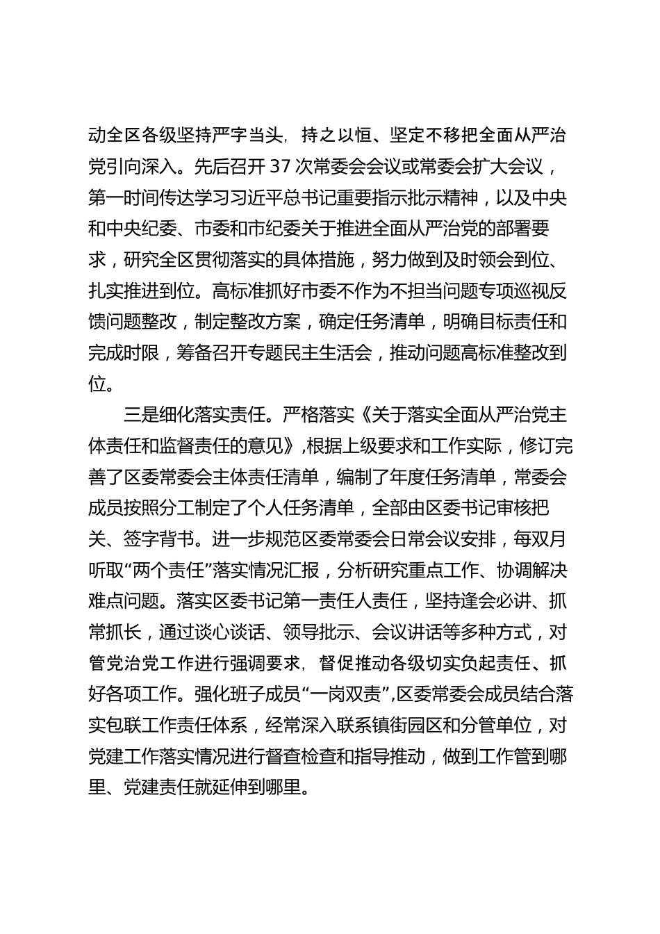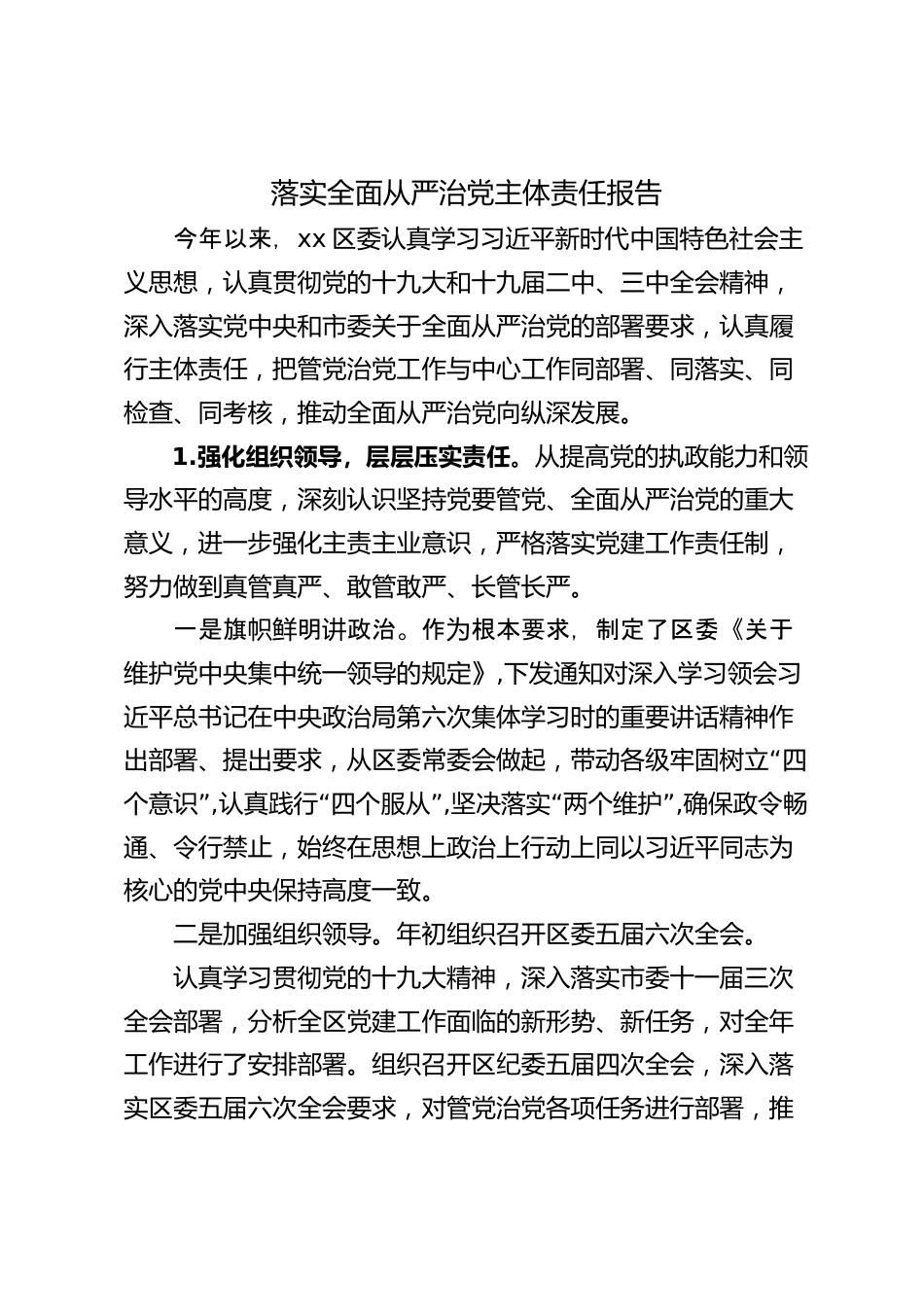 落實(shí)全面從嚴(yán)治黨主體責(zé)任報(bào)告今年以來(lái),xx區(qū)委認(rèn)真學(xué)習(xí)習(xí)近平新時(shí)代中國(guó)特色社會(huì)主義思想,認(rèn)真貫徹黨的十九大和十九屆二中、三中全會(huì)精神,深入落實(shí)黨中央和市委關(guān)于全面從嚴(yán)治黨的部署要求,認(rèn)真履行主體責(zé)任,把管黨治黨工作與中心工作同部署、同落實(shí)、同檢查、同考核,推動(dòng)全面從嚴(yán)治黨向縱深發(fā)展。1.強(qiáng)化組織領(lǐng)導(dǎo),層層壓實(shí)責(zé)任。從提高黨的執(zhí)政能力和領(lǐng)導(dǎo)水平的高度,深刻認(rèn)識(shí)堅(jiān)持黨要管黨、全面從嚴(yán)治黨的重大意義,進(jìn)一步強(qiáng)化主責(zé)主業(yè)意識(shí),嚴(yán)格落實(shí)黨建工作責(zé)任制,努力做到真管真嚴(yán)、敢管敢嚴(yán)、長(zhǎng)管長(zhǎng)嚴(yán)。一是旗明政治。作根本要求,制定了區(qū)委《關(guān)于幟鮮講為...