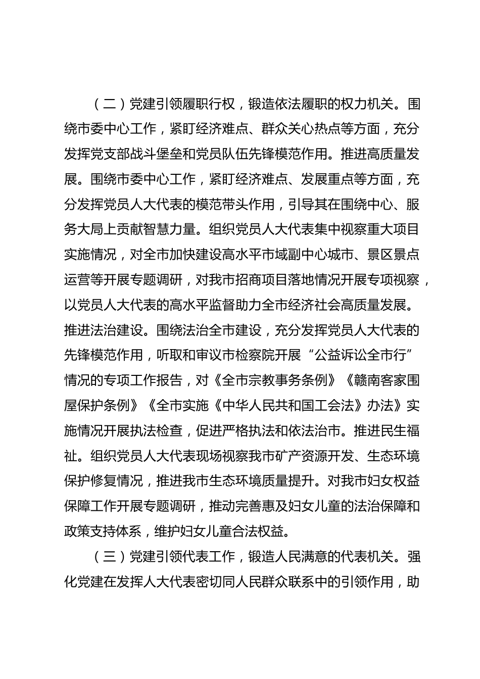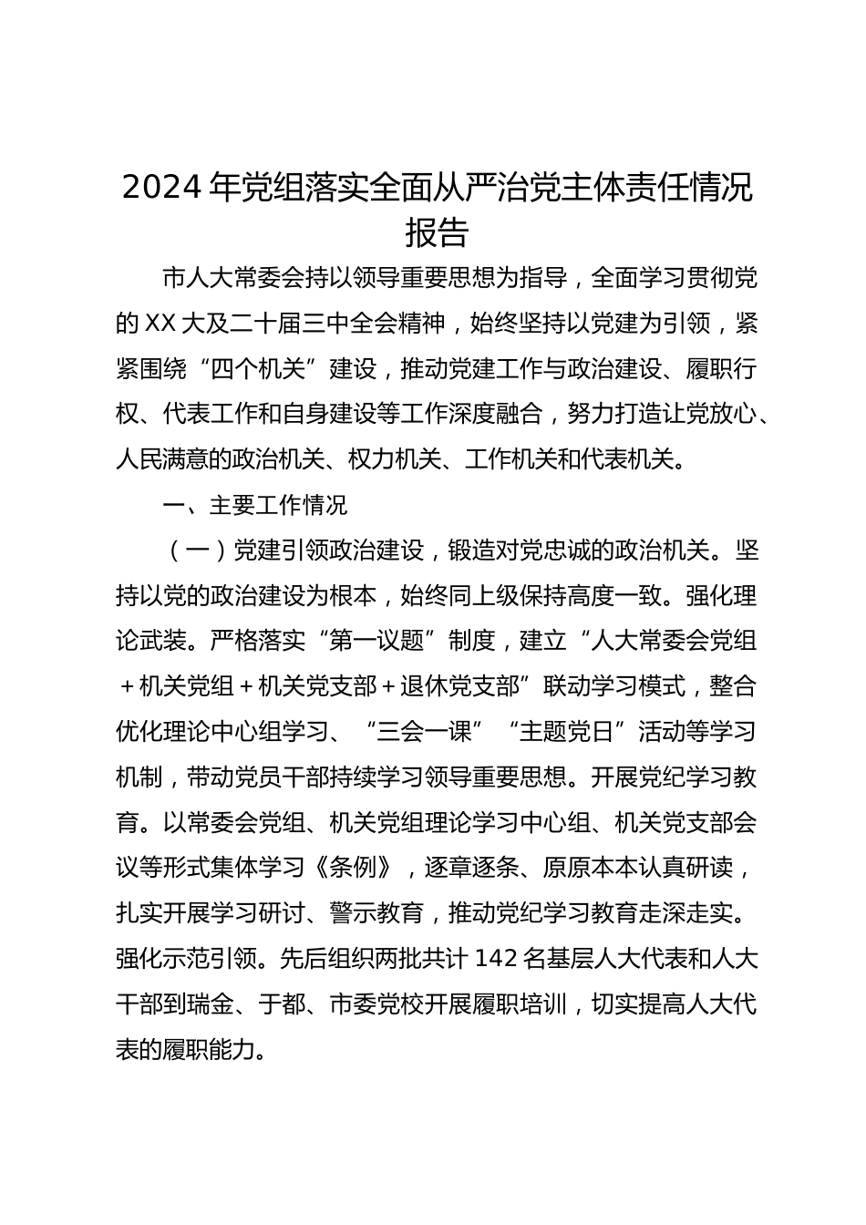 2024年黨組落實全面從嚴治黨主體責任情況報告市人大常委會持以領導重要思想為指導,全面學習貫徹黨的XX大及二十屆三中全會精神,始終堅持以黨建為引領,緊緊圍繞“四個機關”建設,推動黨建工作與政治建設、履職行權、代表工作和自身建設等工作深度融合,努力打造讓黨放心、人民滿意的政治機關、權力機關、工作機關和代表機關。一、主要工作情況(一)黨建引領政治建設,鍛造對黨忠誠的政治機關。堅持以黨的政治建設為根本,始終同上級保持高度一致。強化理論武裝。嚴格落實“第一議題”制度,建立“人大常委會黨組+機關黨組+機關黨支部+退休黨支部”聯(lián)動學習模式,整...
