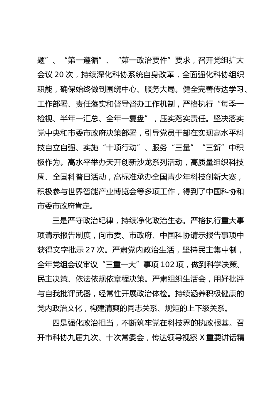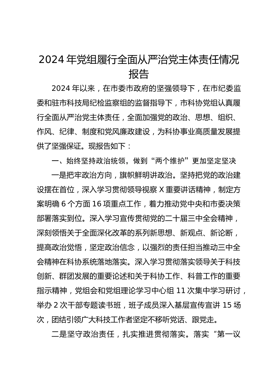 2024年黨組履行全面從嚴(yán)治黨主體責(zé)任情況報(bào)告2024年以來,在市委市政府的堅(jiān)強(qiáng)領(lǐng)導(dǎo)下,在市紀(jì)委監(jiān)委和駐市科技局紀(jì)檢監(jiān)察組的監(jiān)督指導(dǎo)下,市科協(xié)黨組認(rèn)真履行全面從嚴(yán)治黨主體責(zé)任,全面加強(qiáng)黨的政治、思想、組織、作風(fēng)、紀(jì)律、制度和黨風(fēng)廉政建設(shè),為科協(xié)事業(yè)高質(zhì)量發(fā)展提供了堅(jiān)強(qiáng)保證。現(xiàn)報(bào)告如下:一、始終堅(jiān)持政治統(tǒng)領(lǐng),做到“兩個(gè)維護(hù)”更加堅(jiān)定堅(jiān)決一是把牢政治方向,旗幟鮮明講政治。堅(jiān)持把黨的政治建設(shè)擺在首位,深入學(xué)習(xí)貫徹領(lǐng)導(dǎo)視察X重要講話精神,制定方案明確6個(gè)方面16項(xiàng)重點(diǎn)工作,著力推動黨中央和市委決策部署落實(shí)到位。深入學(xué)習(xí)宣傳貫徹黨的二十屆三中全會...