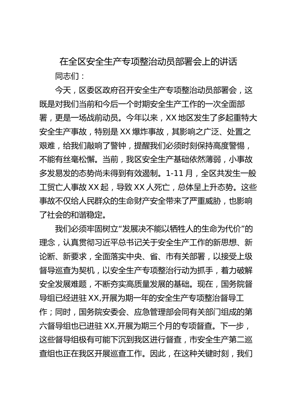 在全區(qū)安全生產(chǎn)專項(xiàng)整治動(dòng)員部署會(huì)上的講話VIP免費(fèi)