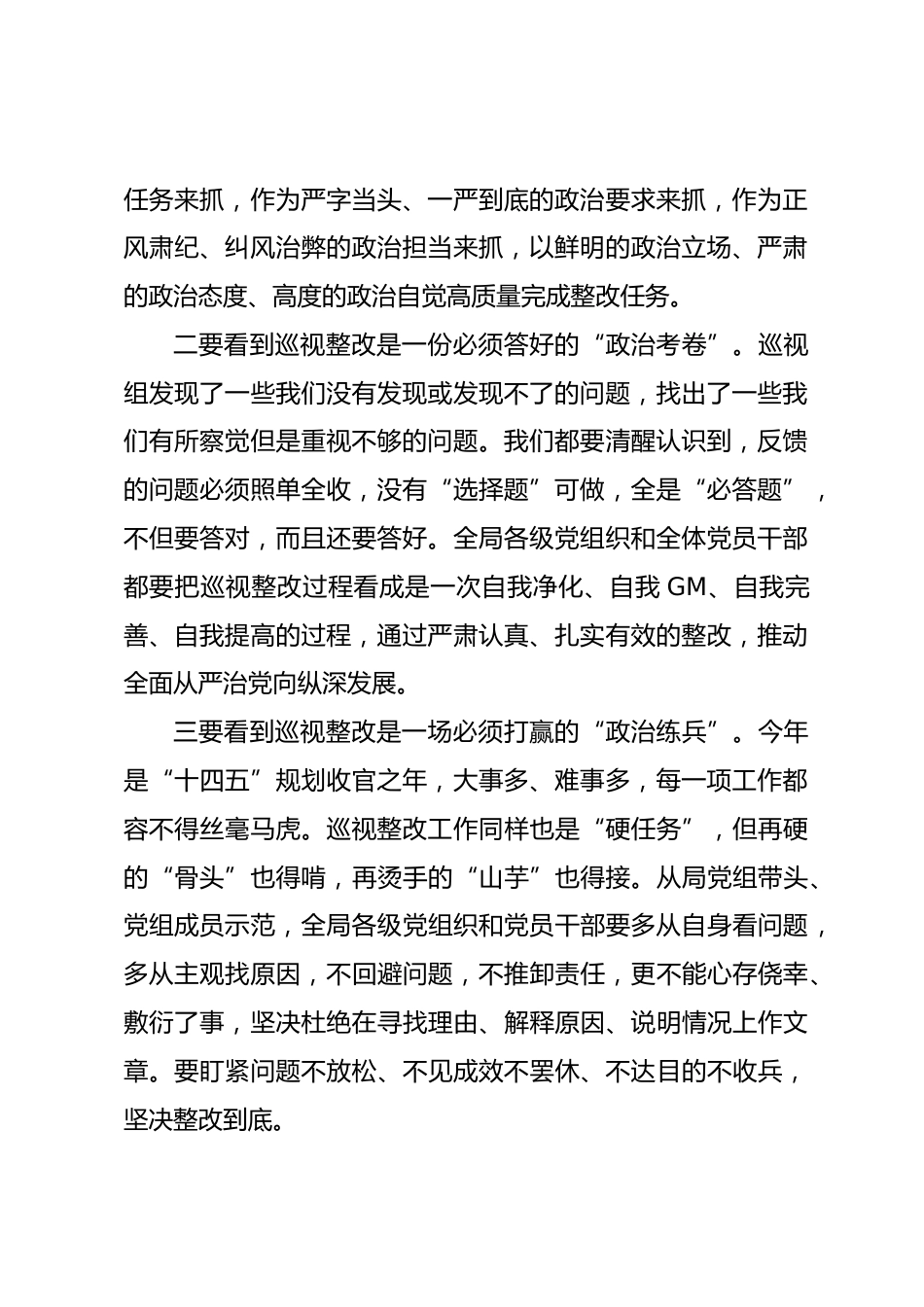 2024年在巡視整改專題民主生活會(huì)上的講話剛才,我們通報(bào)了XX關(guān)于巡視XX的反饋意見(jiàn),傳達(dá)了XX關(guān)于做好巡視整改工作的指示要求。召開(kāi)今天這個(gè)會(huì)議,就是把問(wèn)題認(rèn)領(lǐng)下來(lái),把思想統(tǒng)一起來(lái),把任務(wù)分解下去,把壓力傳導(dǎo)出去,把大家調(diào)動(dòng)起來(lái),凝聚合力打好這場(chǎng)巡視整改“攻堅(jiān)戰(zhàn)”和存量問(wèn)題“殲滅戰(zhàn)”。下面,我代表局黨組講XX點(diǎn)意見(jiàn)。一、巡視整改是一堂“政治課”,必須嚴(yán)肅對(duì)待巡視整改“后半篇文章”作得好不好,能不能把巡視反饋問(wèn)題整改到位,是對(duì)局黨組、全局各級(jí)黨組織和黨員干部是否樹(shù)牢“四個(gè)意識(shí)”、做到“兩個(gè)維護(hù)”的檢驗(yàn),是對(duì)黨是否絕對(duì)忠誠(chéng)的檢驗(yàn)。大家一定要...