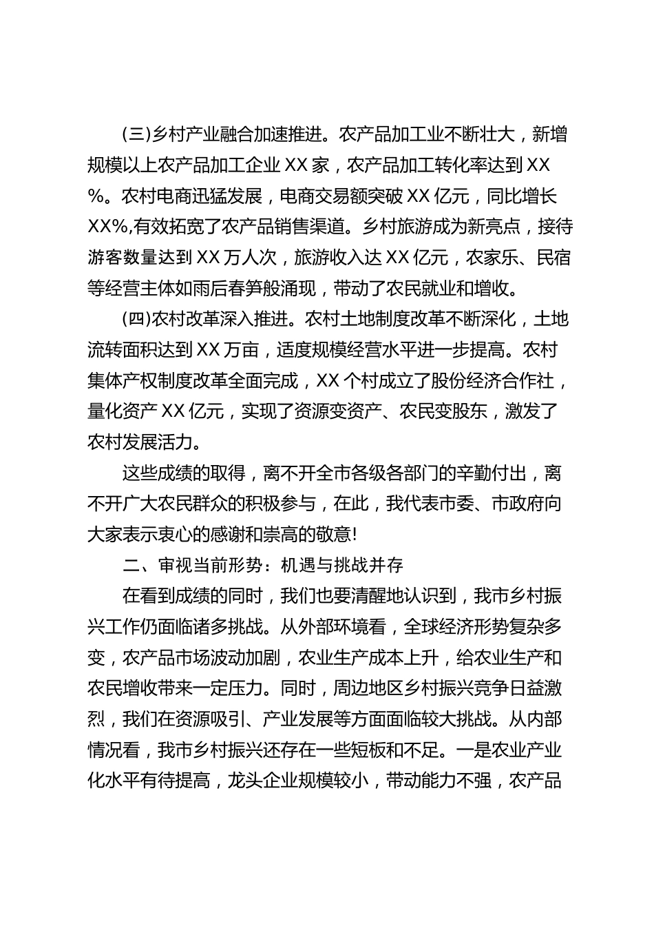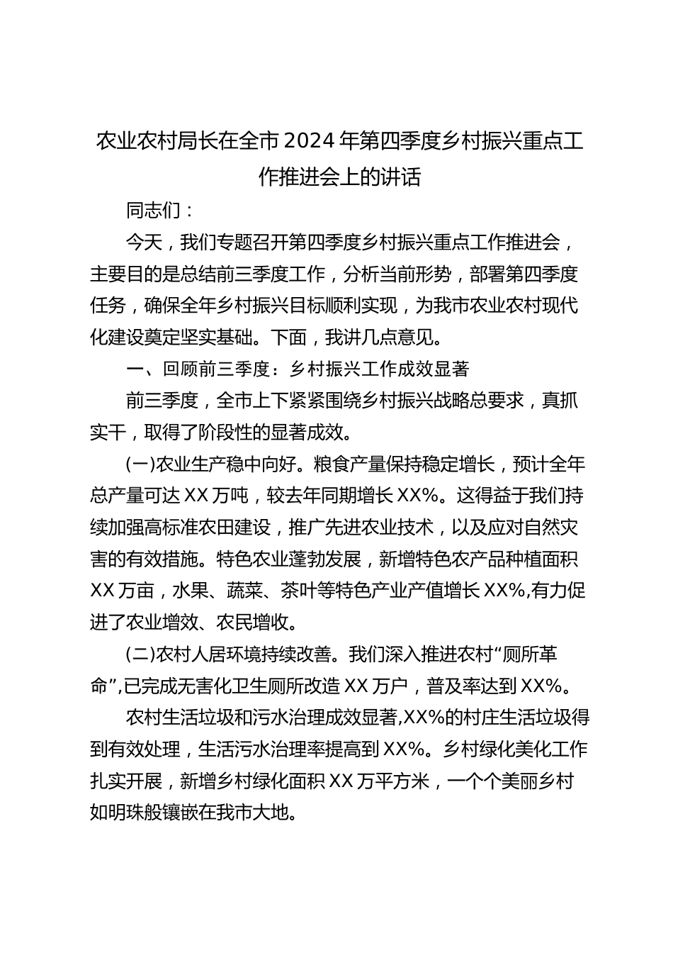 農業(yè)農村局長在全市2024年第四季度鄉(xiāng)村振興重點工作推進會上的講話同志們:今天,我們專題召開第四季度鄉(xiāng)村振興重點工作推進會,主要目的是總結前三季度工作,分析當前形勢,部署第四季度任務,確保全年鄉(xiāng)村振興目標順利實現(xiàn),為我市農業(yè)農村現(xiàn)代化建設奠定堅實基礎。下面,我講幾點意見。一、回顧前三季度:鄉(xiāng)村振興工作成效顯著前三季度,全市上下緊緊圍繞鄉(xiāng)村振興戰(zhàn)略總要求,真抓實干,取得了階段性的顯著成效。(一)農業(yè)生產(chǎn)穩(wěn)中向好。糧食產(chǎn)量保持穩(wěn)定增長,預計全年總產(chǎn)量可達XX萬噸,較去年同期增長XX%。這得益于我們持續(xù)加強高標準農田建設,推廣先進農業(yè)技術,...