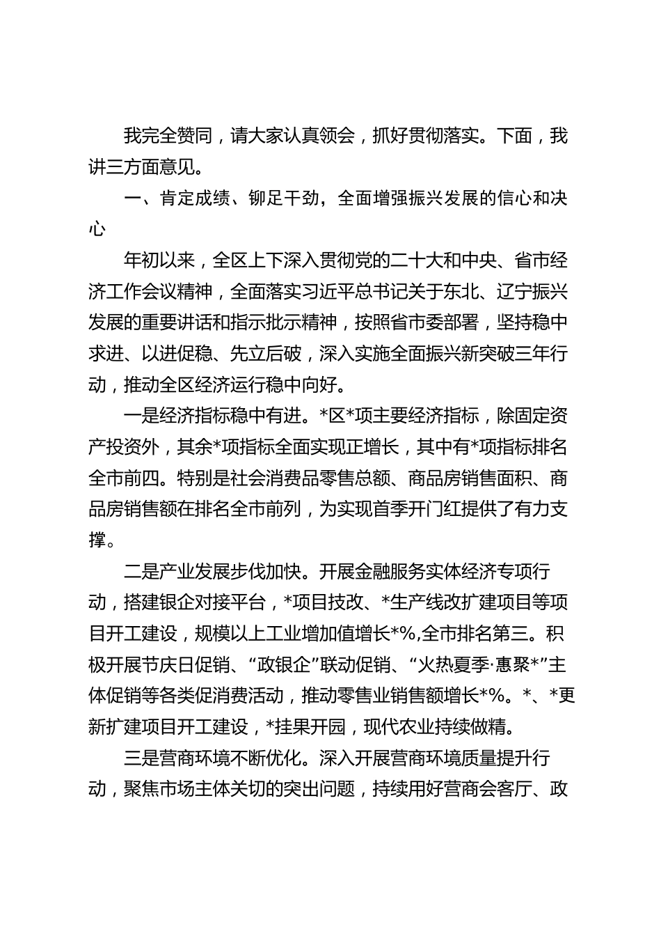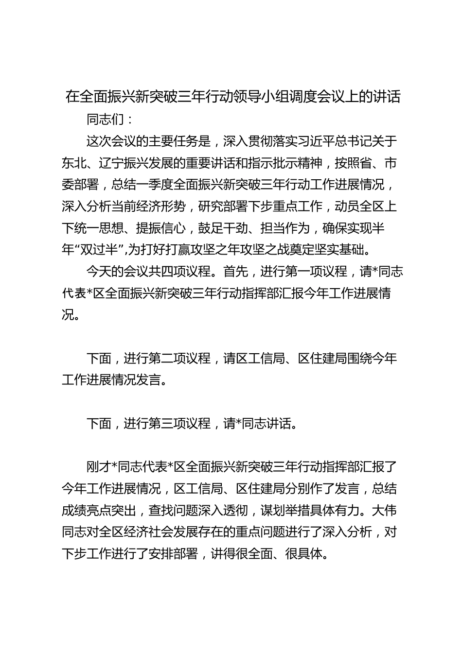 在全面振興新突破三年行動領(lǐng)導(dǎo)小組調(diào)度會議上的講話同志們:這次會議的主要任務(wù)是,深入貫徹落實(shí)習(xí)近平總書記關(guān)于東北、遼寧振興發(fā)展的重要講話和指示批示精神,按照省、市委部署,總結(jié)一季度全面振興新突破三年行動工作進(jìn)展情況,深入分析當(dāng)前經(jīng)濟(jì)形勢,研究部署下步重點(diǎn)工作,動員全區(qū)上下統(tǒng)一思想、提振信心,鼓足干勁、擔(dān)當(dāng)作為,確保實(shí)現(xiàn)半“”年雙過半,為打好打贏攻堅(jiān)之年攻堅(jiān)之戰(zhàn)奠定堅(jiān)實(shí)基礎(chǔ)。今天的會議共四項(xiàng)議程。首先,進(jìn)行第一項(xiàng)議程,請*同志代表*區(qū)全面振興新突破三年行動指揮部匯報(bào)今年工作進(jìn)展情況。下面,進(jìn)行第二項(xiàng)議程,請區(qū)工信局、區(qū)住建局圍繞今...