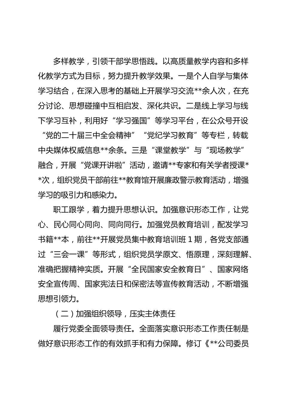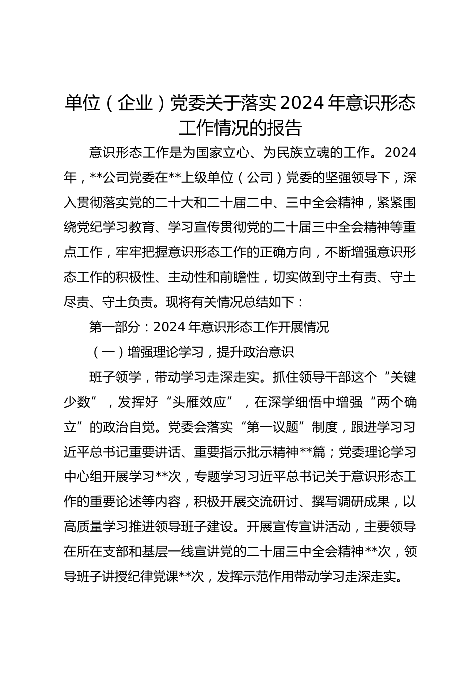 單位(企業(yè))黨委關(guān)于落實(shí)2024年意識形態(tài)工作情況的報(bào)告意識形態(tài)工作是為國家立心、為民族立魂的工作。2024年,**公司黨委在**上級單位(公司)黨委的堅(jiān)強(qiáng)領(lǐng)導(dǎo)下,深入貫徹落實(shí)黨的二十大和二十屆二中、三中全會精神,緊緊圍繞黨紀(jì)學(xué)習(xí)教育、學(xué)習(xí)宣傳貫徹黨的二十屆三中全會精神等重點(diǎn)工作,牢牢把握意識形態(tài)工作的正確方向,不斷增強(qiáng)意識形態(tài)工作的積極性、主動性和前瞻性,切實(shí)做到守土有責(zé)、守土盡責(zé)、守土負(fù)責(zé)?,F(xiàn)將有關(guān)情況總結(jié)如下:第一部分:2024年意識形態(tài)工作開展情況(一)增強(qiáng)理論學(xué)習(xí),提升政治意識班子領(lǐng)學(xué),帶動學(xué)習(xí)走深走實(shí)。抓住領(lǐng)導(dǎo)干部這個“關(guān)鍵少數(shù)...
