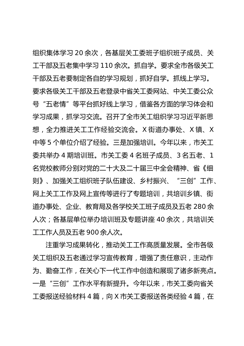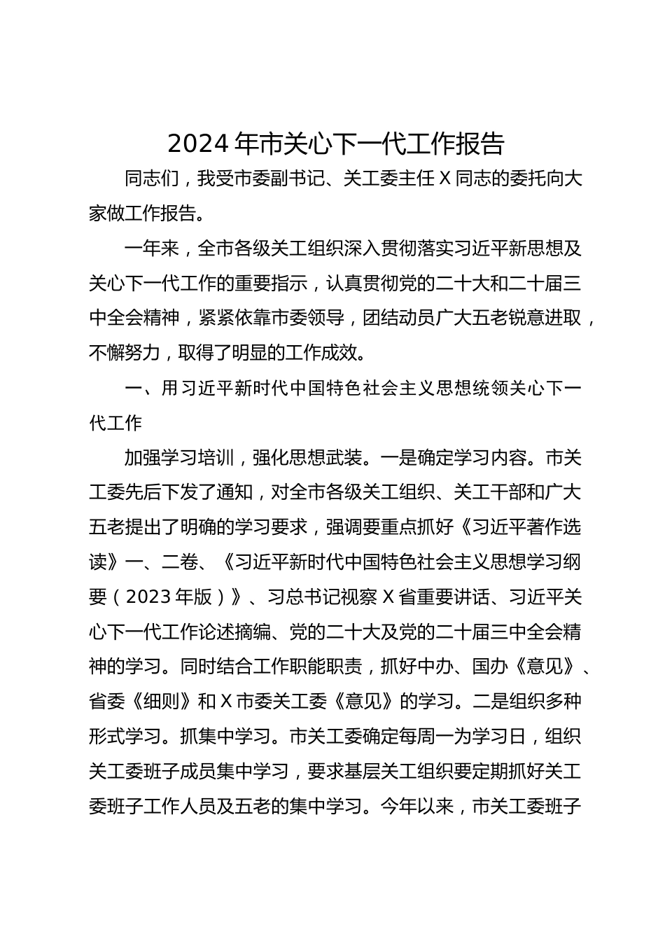 2024年市關(guān)心下一代工作報(bào)告同志們,我受市委副書(shū)記、關(guān)工委主任X同志的委托向大家做工作報(bào)告。一年來(lái),全市各級(jí)關(guān)工組織深入貫徹落實(shí)習(xí)近平新思想及關(guān)心下一代工作的重要指示,認(rèn)真貫徹黨的二十大和二十屆三中全會(huì)精神,緊緊依靠市委領(lǐng)導(dǎo),團(tuán)結(jié)動(dòng)員廣大五老銳意進(jìn)取,不懈努力,取得了明顯的工作成效。一、用習(xí)近平新時(shí)代中國(guó)特色社會(huì)主義思想統(tǒng)領(lǐng)關(guān)心下一代工作加強(qiáng)學(xué)習(xí)培訓(xùn),強(qiáng)化思想武裝。一是確定學(xué)習(xí)內(nèi)容。市關(guān)工委先后下發(fā)了通知,對(duì)全市各級(jí)關(guān)工組織、關(guān)工干部和廣大五老提出了明確的學(xué)習(xí)要求,強(qiáng)調(diào)要重點(diǎn)抓好《習(xí)近平著作選讀》一、二卷、《習(xí)近平新時(shí)代中國(guó)特...