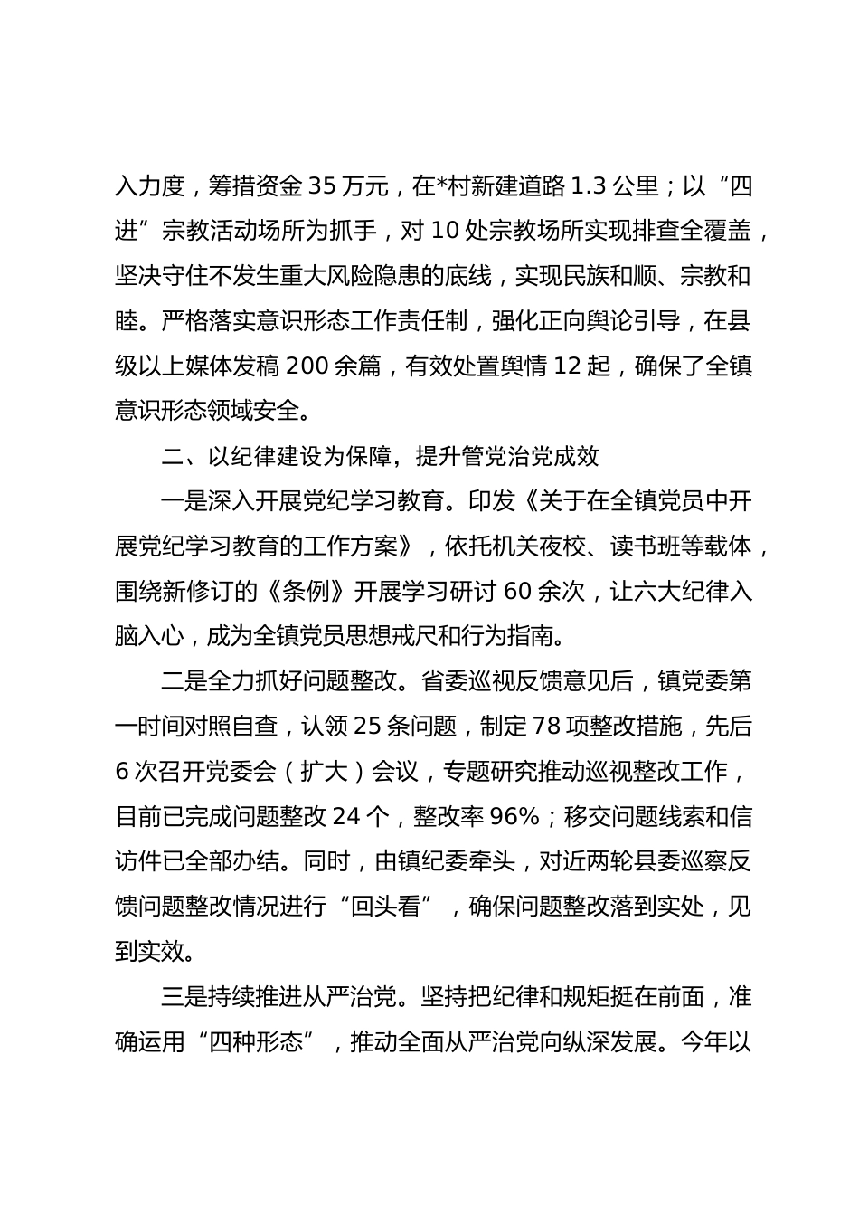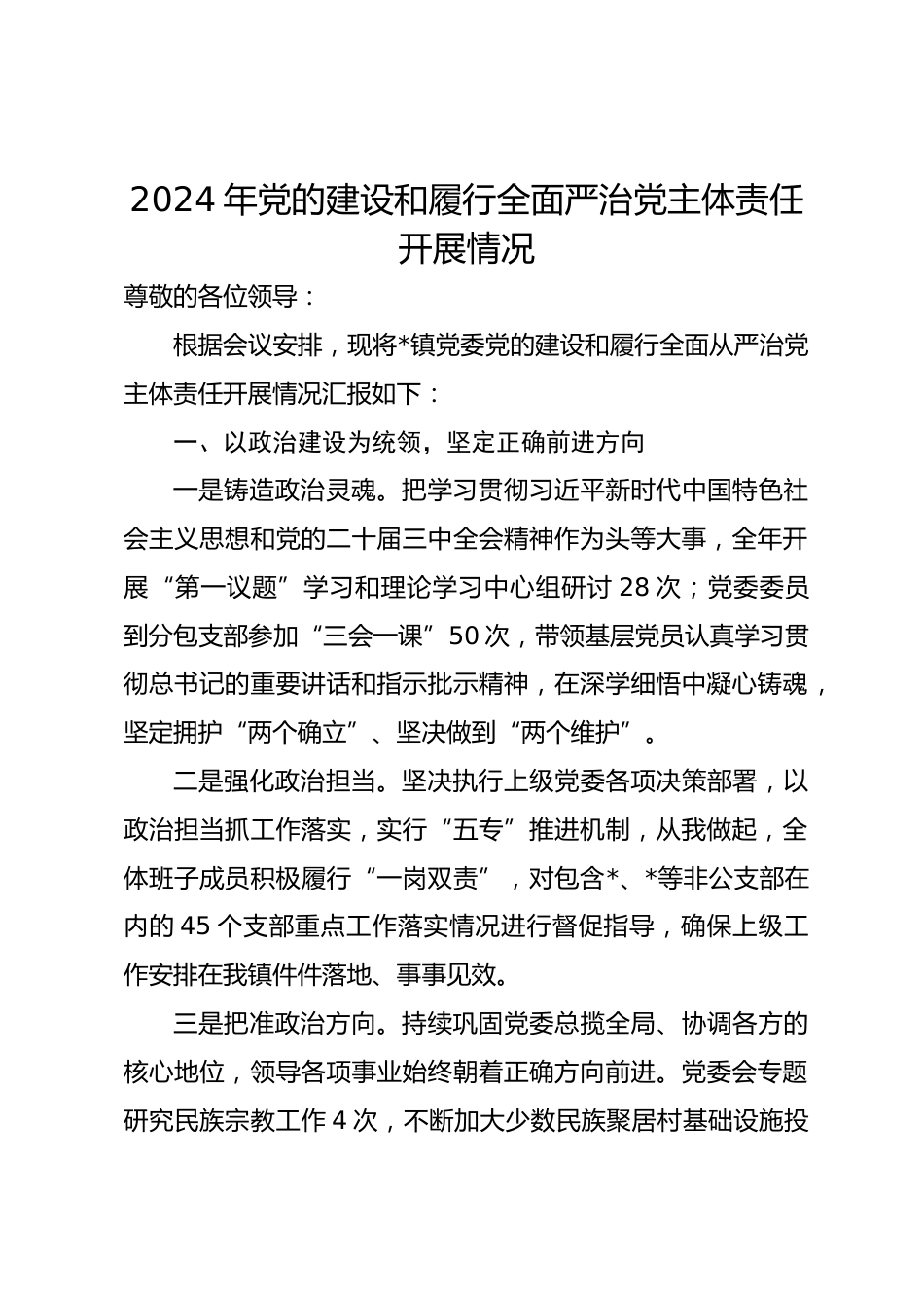 2024年黨的建設(shè)和履行全面嚴治黨主體責(zé)任開展情況尊敬的各位領(lǐng)導(dǎo):根據(jù)會議安排,現(xiàn)將*鎮(zhèn)黨委黨的建設(shè)和履行全面從嚴治黨主體責(zé)任開展情況匯報如下:一、以政治建設(shè)為統(tǒng)領(lǐng),堅定正確前進方向一是鑄造政治靈魂。把學(xué)習(xí)貫徹習(xí)近平新時代中國特色社會主義思想和黨的二十屆三中全會精神作為頭等大事,全年開展“第一議題”學(xué)習(xí)和理論學(xué)習(xí)中心組研討28次;黨委委員到分包支部參加“三會一課”50次,帶領(lǐng)基層黨員認真學(xué)習(xí)貫徹總書記的重要講話和指示批示精神,在深學(xué)細悟中凝心鑄魂,堅定擁護“兩個確立”、堅決做到“兩個維護”。二是強化政治擔當。堅決執(zhí)行上級黨委各項決策...