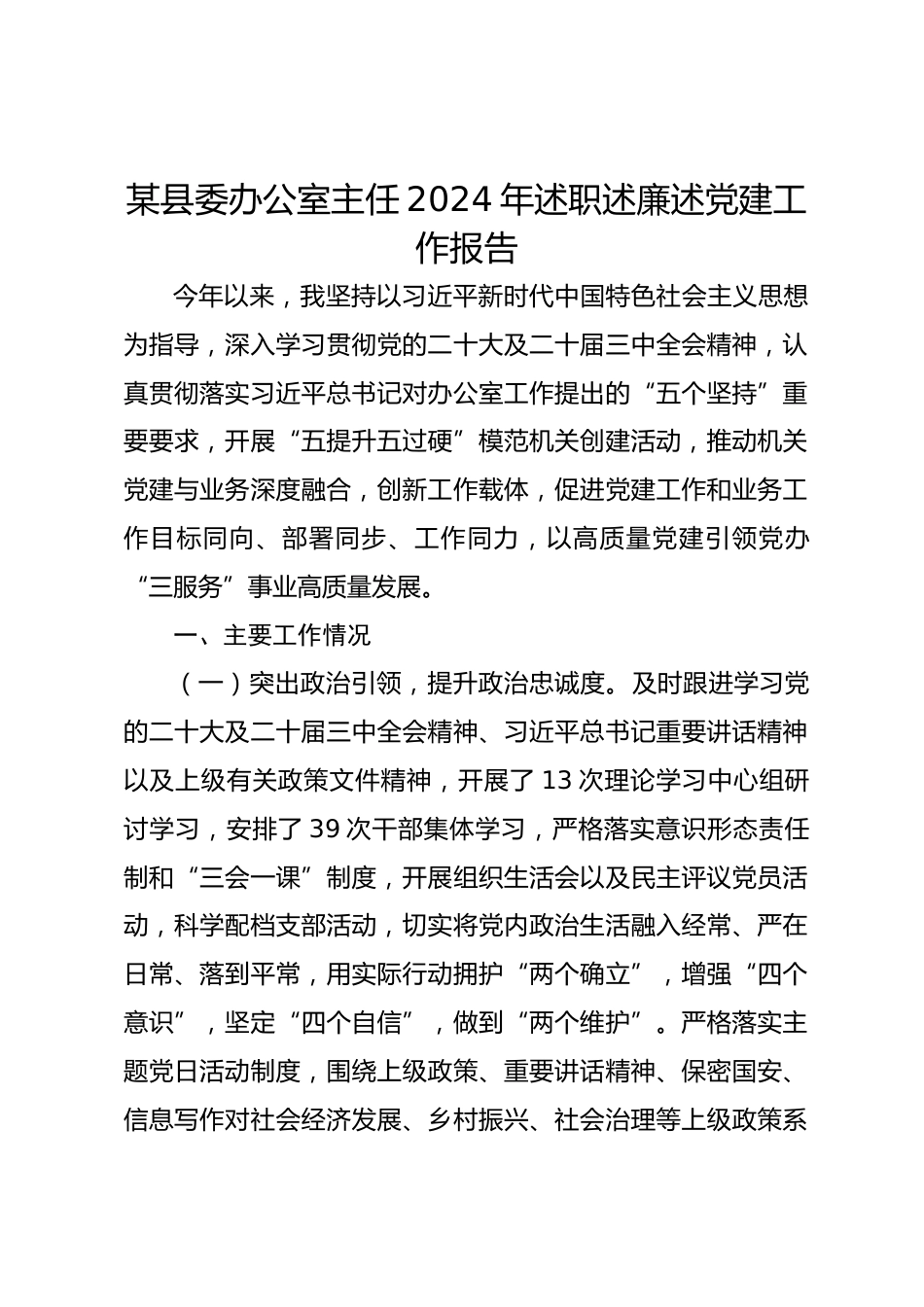 某縣委辦公室主任2024年述職述廉述黨建工作報告VIP免費