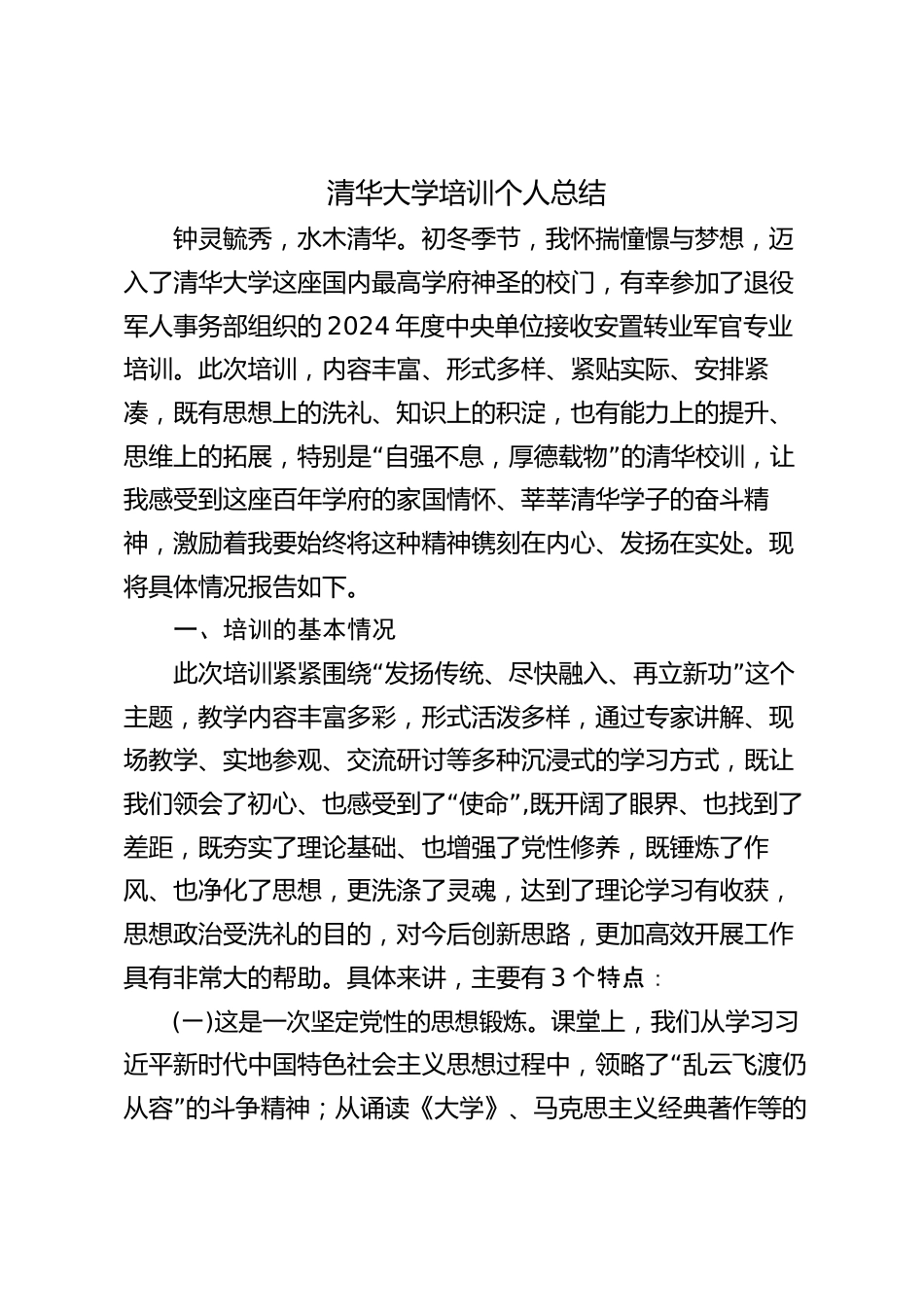 清華大學(xué)培訓(xùn)個人總結(jié)鐘靈毓秀,水木清華。初冬季節(jié),我懷揣憧憬與夢想,邁入了清華大學(xué)這座國內(nèi)最高學(xué)府神圣的校門,有幸參加了退役軍人事務(wù)部組織的2024年度中央單位接收安置轉(zhuǎn)業(yè)軍官專業(yè)培訓(xùn)。此次培訓(xùn),內(nèi)容豐富、形式多樣、緊貼實際、安排緊湊,既有思想上的洗禮、知識上的積淀,也有能力上的提升、“”思維上的拓展,特別是自強不息,厚德載物的清華校訓(xùn),讓我感受到這座百年學(xué)府的家國情懷、莘莘清華學(xué)子的奮斗精神,激勵著我要始終將這種精神鐫刻在內(nèi)心、發(fā)揚在實處?,F(xiàn)將具體情況報告如下。一、培訓(xùn)的基本情況“”此次培訓(xùn)緊緊圍繞發(fā)揚傳統(tǒng)、盡快融入、再立新功...
