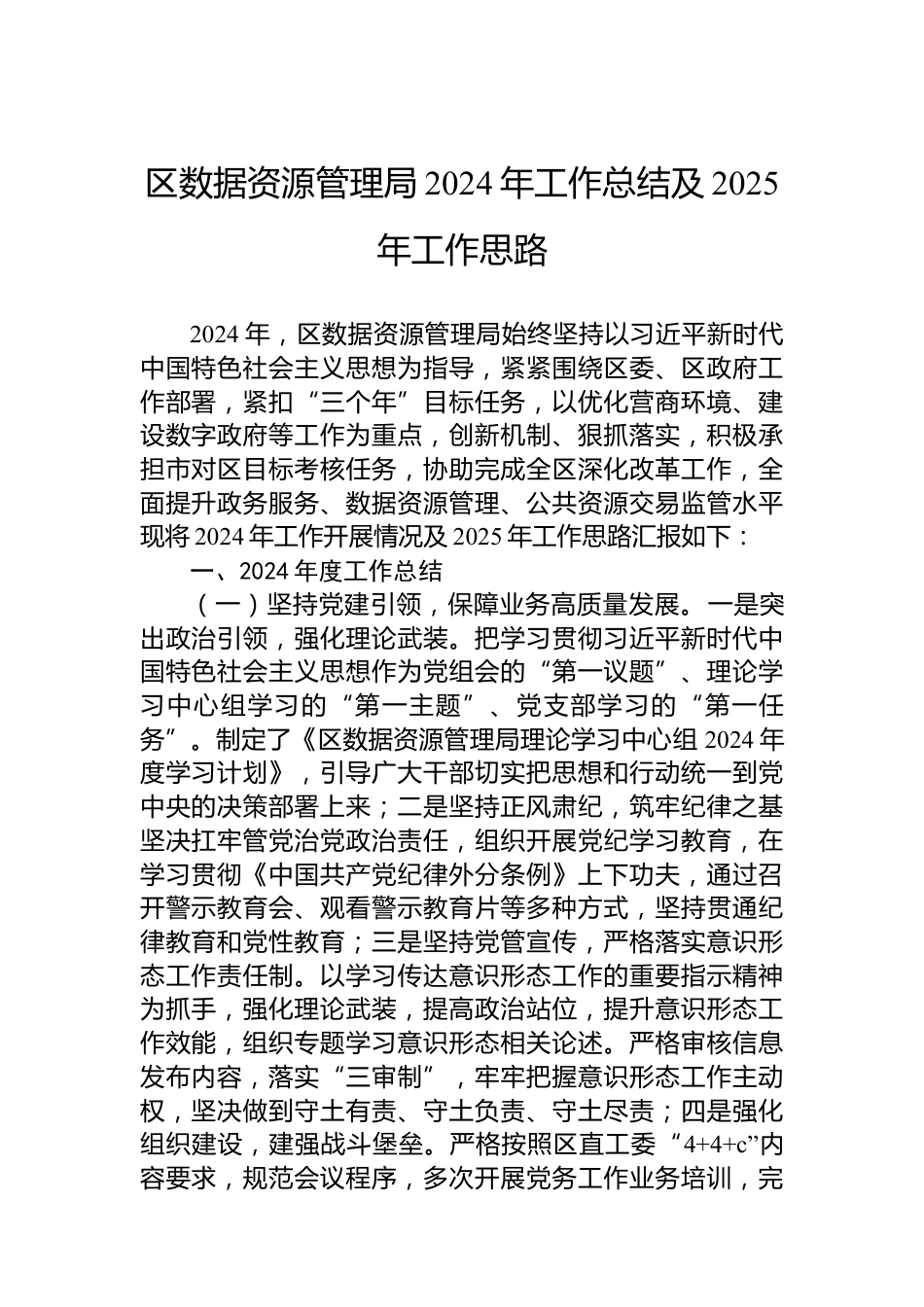 數(shù)據(jù)資源管理局2024年工作總結(jié)匯編(5篇)目錄1.區(qū)數(shù)據(jù)資源管理局2024年工作總結(jié)及2025年工作思路22.縣數(shù)據(jù)資源管理局2024年度工作總結(jié)和2025年度工作計(jì)劃................................................................153.縣數(shù)據(jù)資源管理局2024年工作總結(jié)和2025年工作安排.......................................................................244.縣數(shù)據(jù)資源管理局2024年工作總結(jié)和2025年工作計(jì)劃.......................................................................295.縣數(shù)據(jù)資源管理局2024年政務(wù)公開工作總結(jié).....37區(qū)數(shù)據(jù)資源管理局2024年工作總結(jié)...