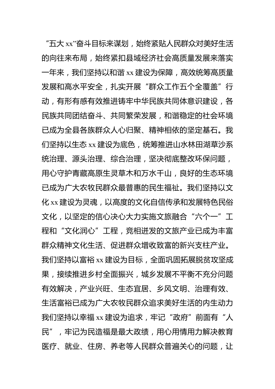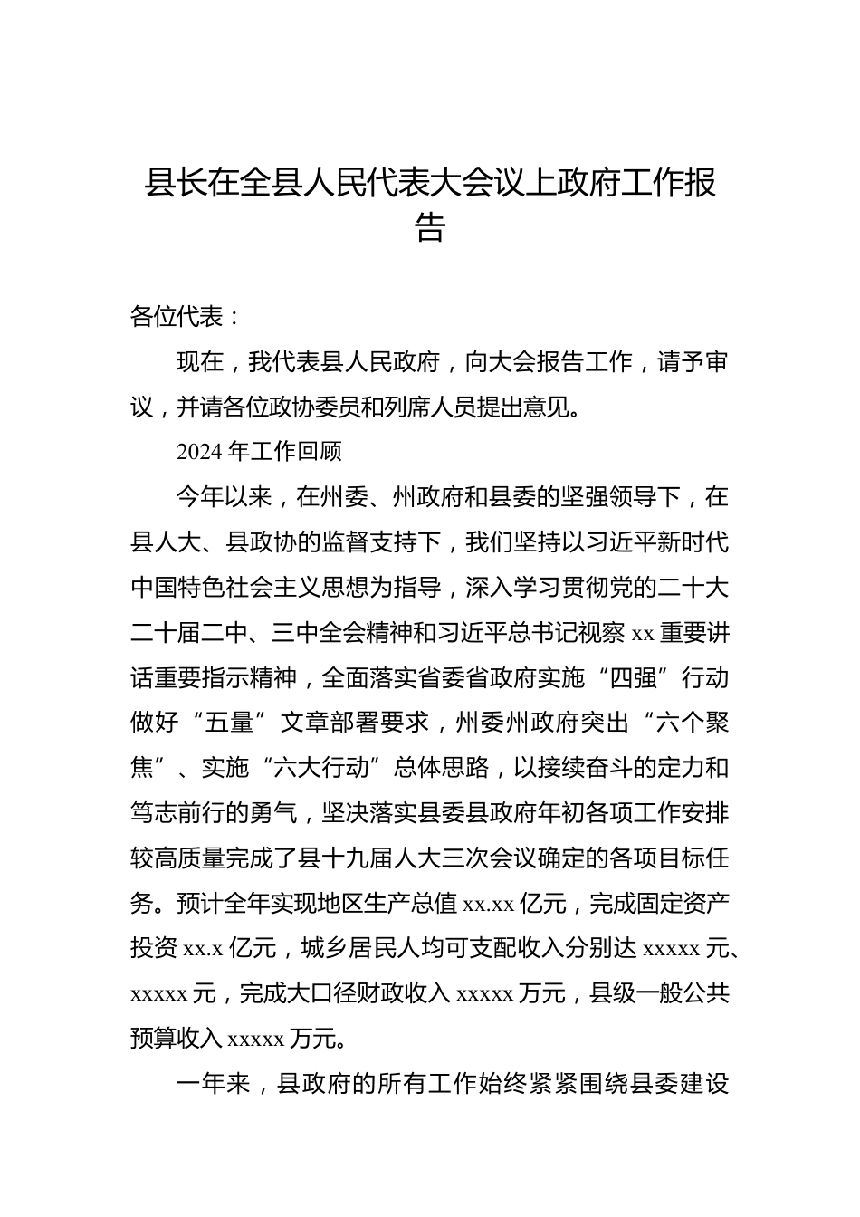 縣長(zhǎng)在全縣人民代表大會(huì)議上政府工作報(bào)告各位代表:現(xiàn)在,我代表縣人民政府,向大會(huì)報(bào)告工作,請(qǐng)予審議,并請(qǐng)各位政協(xié)委員和列席人員提出意見(jiàn)。2024年工作回顧今年以來(lái),在州委、州政府和縣委的堅(jiān)強(qiáng)領(lǐng)導(dǎo)下,在縣人大、縣政協(xié)的監(jiān)督支持下,我們堅(jiān)持以習(xí)近平新時(shí)代中國(guó)特色社會(huì)主義思想為指導(dǎo),深入學(xué)習(xí)貫徹黨的二十大二十屆二中、三中全會(huì)精神和習(xí)近平總書(shū)記視察xx重要講話重要指示精神,全面落實(shí)省委省政府實(shí)施“四強(qiáng)”行動(dòng)做好“五量”文章部署要求,州委州政府突出“六個(gè)聚焦”、實(shí)施“六大行動(dòng)”總體思路,以接續(xù)奮斗的定力和篤志前行的勇氣,堅(jiān)決落實(shí)縣委縣政府年初...