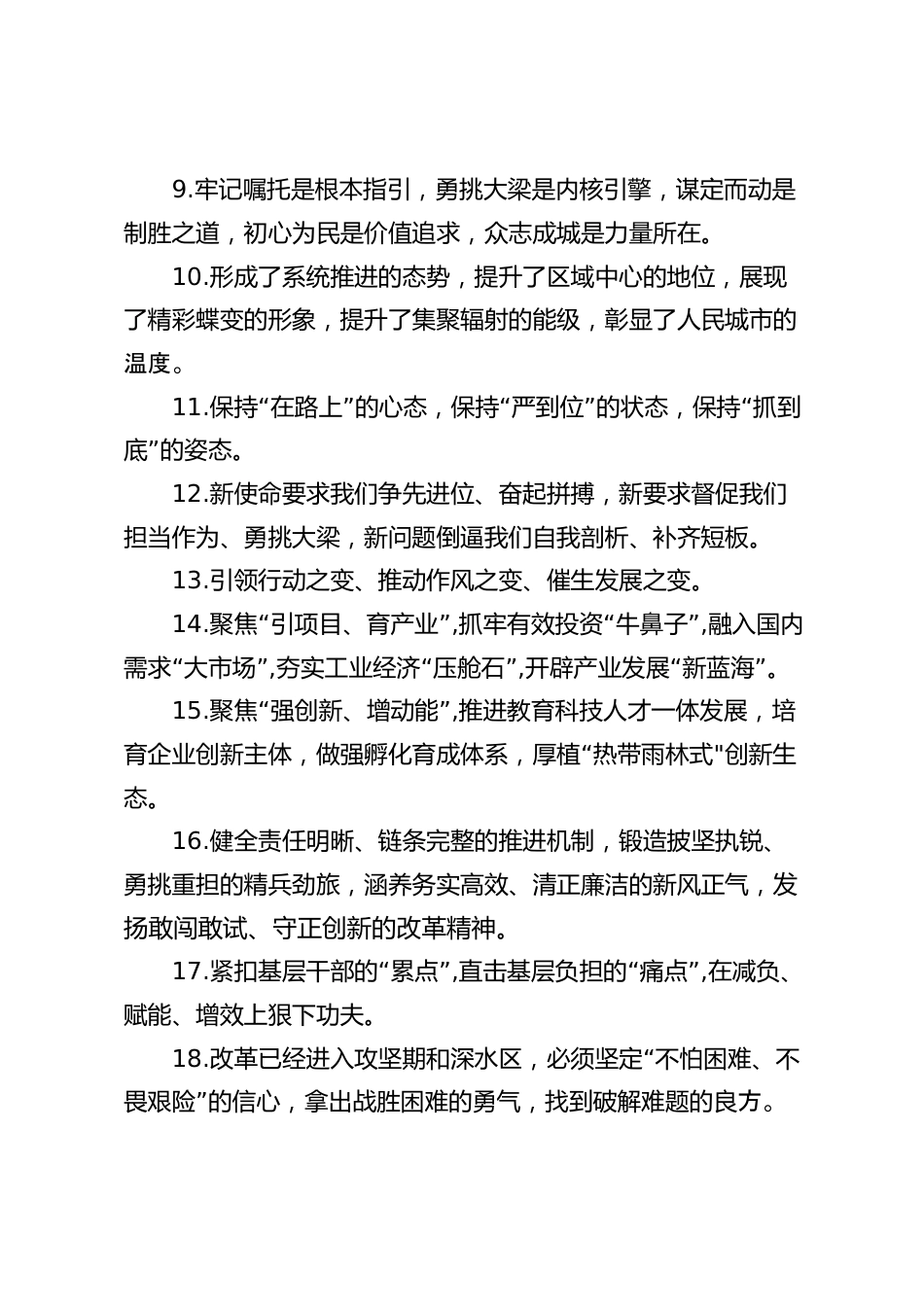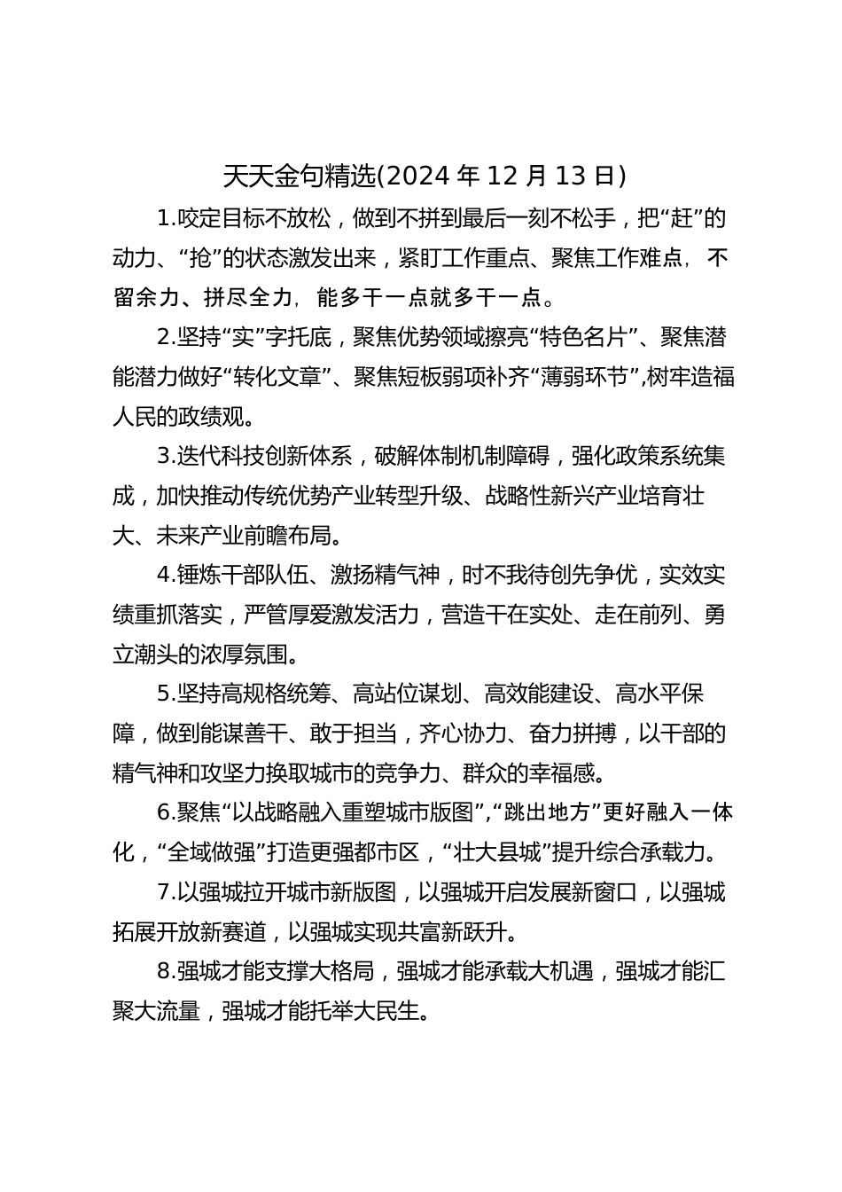 天天金句精選(2024年12月13日)1.“”咬定目標(biāo)不放松,做到不拼到最后一刻不松手,把趕的“”動(dòng)力、搶的狀態(tài)激發(fā)出來,緊盯工作重點(diǎn)、聚焦工作難點(diǎn),不留余力、拼盡全力,能多干一點(diǎn)就多干一點(diǎn)。2.“”“”堅(jiān)持實(shí)字托底,聚焦優(yōu)勢領(lǐng)域擦亮特色名片、聚焦?jié)摗啊薄啊蹦軡摿ψ龊棉D(zhuǎn)化文章、聚焦短板弱項(xiàng)補(bǔ)齊薄弱環(huán)節(jié),樹牢造福人民的政績觀。3.迭代科技創(chuàng)新體系,破解體制機(jī)制障礙,強(qiáng)化政策系統(tǒng)集成,加快推動(dòng)傳統(tǒng)優(yōu)勢產(chǎn)業(yè)轉(zhuǎn)型升級(jí)、戰(zhàn)略性新興產(chǎn)業(yè)培育壯大、未來產(chǎn)業(yè)前瞻布局。4.錘煉干部隊(duì)伍、激揚(yáng)精氣神,時(shí)不我待創(chuàng)先爭優(yōu),實(shí)效實(shí)績重抓落實(shí),嚴(yán)管厚愛激發(fā)活力,營造干在...