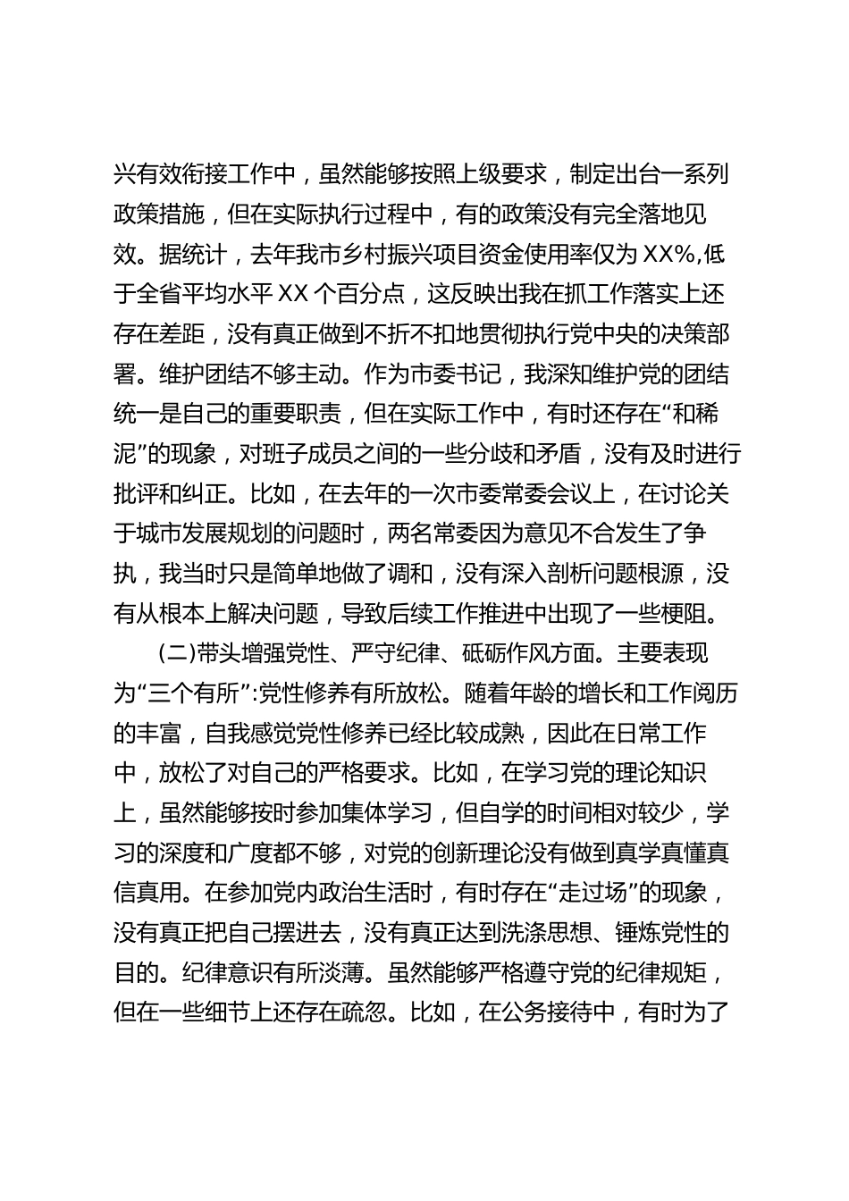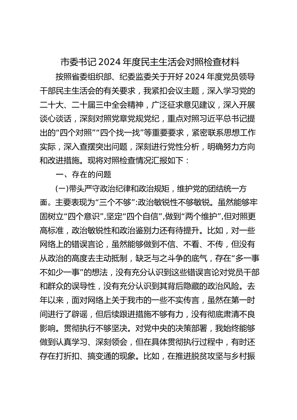 市委書記2024年度民主生活會對照檢查材料按照省委組織部、紀(jì)委監(jiān)委關(guān)于開好2024年度黨員領(lǐng)導(dǎo)干部民主生活會的有關(guān)要求,我緊扣會議主題,深入學(xué)習(xí)黨的二十大、二十屆三中全會精神,廣泛征求意見建議,深入開展談心談話,深刻對照黨章黨規(guī)黨紀(jì),重點對照習(xí)近平總書記提“”“”出的四個對照四個找一找等重要要求,緊密聯(lián)系思想工作實際,深入查擺突出問題,深刻進行黨性分析,明確努力方向和改進措施?,F(xiàn)將對照檢查情況匯報如下:一、存在的問題(一)帶頭嚴(yán)守政治紀(jì)律和政治規(guī)矩,維護黨的團結(jié)統(tǒng)一方面?!啊敝饕憩F(xiàn)為三個不夠:政治敏銳性不夠敏銳。雖然能夠牢“”固樹立...