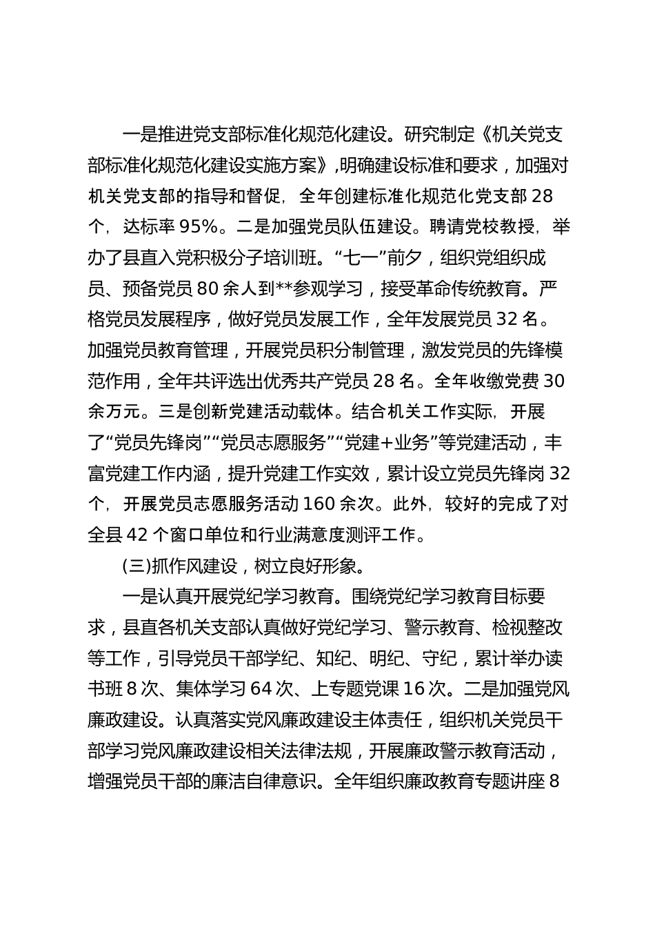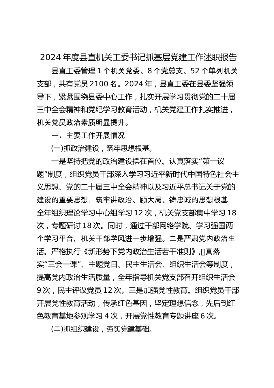 2024年度縣直機(jī)關(guān)工委書記抓基層黨建工作述職報告縣直工委管理1個機(jī)關(guān)黨委、8個黨總支、52個列機(jī)關(guān)單支部,共有黨員2100名。2024年,縣直工委在縣委堅強(qiáng)領(lǐng)導(dǎo)下,緊緊圍繞縣委中心工作,扎實開展學(xué)習(xí)貫徹黨的二十屆三中全會精神和黨紀(jì)學(xué)習(xí)教育活動,機(jī)關(guān)黨建工作扎實推進(jìn),機(jī)關(guān)黨政治素明提升。員質(zhì)顯一、主要工作開展情況(一)抓政治建設(shè),筑牢思想根基?!耙皇菆猿职腰h的政治建設(shè)擺在首位。認(rèn)真落實第一議”題制度,組織黨員干部深入學(xué)習(xí)習(xí)近平新時代中國特色社會主義思想、黨的二十屆三中全會精神以及習(xí)近平總書記關(guān)于黨的建的重要思想,筑牢政治、大局、忠的思想根基,...