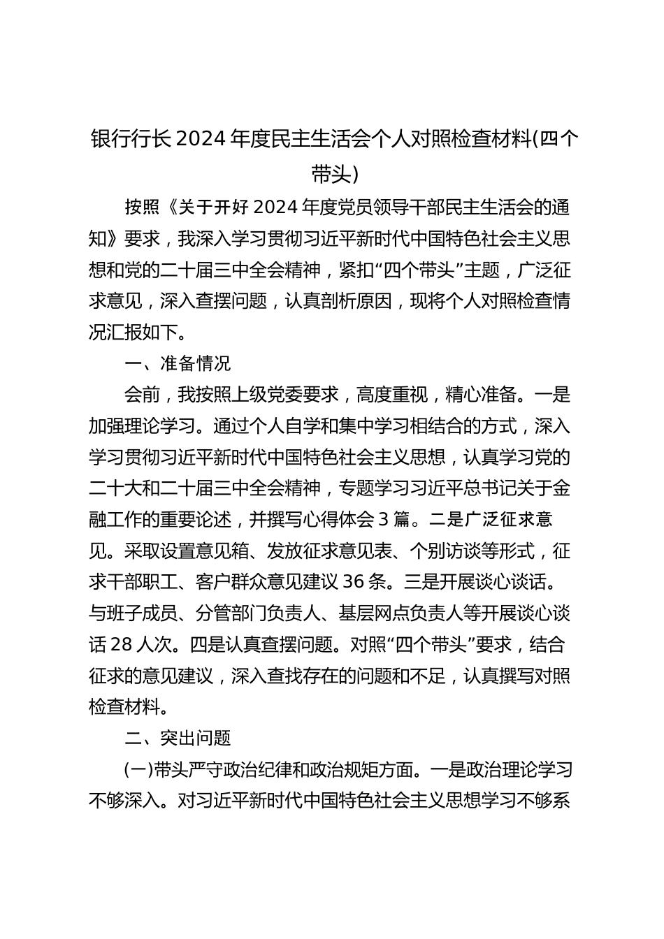 銀行行長2024年度民主生活會(huì)個(gè)人對照檢查材料(四個(gè)帶頭)按照《關(guān)于開好2024年度黨員領(lǐng)導(dǎo)干部民主生活會(huì)的通知》要求,我深入學(xué)習(xí)貫徹習(xí)近平新時(shí)代中國特色社會(huì)主義思“”想和黨的二十屆三中全會(huì)精神,緊扣四個(gè)帶頭主題,廣泛征求意見,深入查擺問題,認(rèn)真剖析原因,現(xiàn)將個(gè)人對照檢查情況匯報(bào)如下。一、準(zhǔn)備情況會(huì)前,我按照上級黨委要求,高度重視,精心準(zhǔn)備。一是加強(qiáng)理論學(xué)習(xí)。通過個(gè)人自學(xué)和集中學(xué)習(xí)相結(jié)合的方式,深入學(xué)習(xí)貫徹習(xí)近平新時(shí)代中國特色社會(huì)主義思想,認(rèn)真學(xué)習(xí)黨的二十大和二十屆三中全會(huì)精神,專題學(xué)習(xí)習(xí)近平總書記關(guān)于金融工作的重要論述,并撰寫心得體...