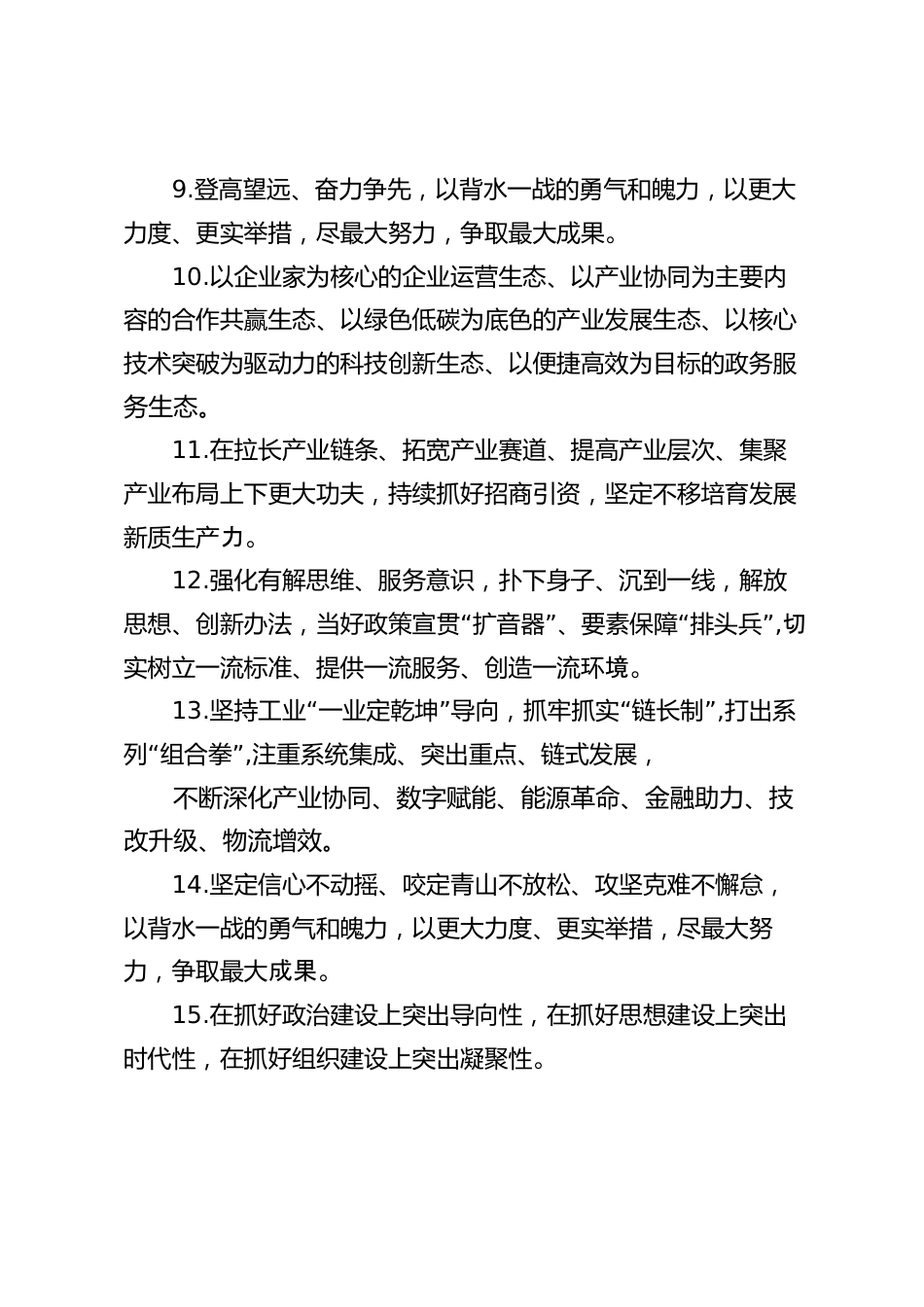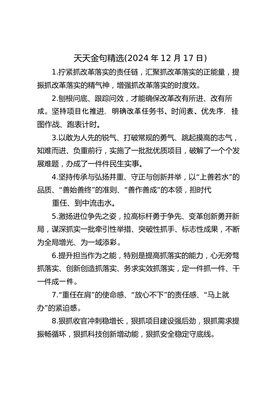 天天金句精選(2024年12月17日)1.擰緊抓改革落實的責任鏈,匯聚抓改革落實的正能量,提振抓改革落實的精氣神,增強抓改革落實的時度效。2.刨根問底、跟蹤問效,才能確保改革改有所進、改有所成。持目化推,明確改革任、表、先序,掛堅項進務書時間優(yōu)圖作戰(zhàn)、跑表計時。3.以敢為人先的銳氣、打破常規(guī)的勇氣、跳起摸高的志氣,知難而進、負重前行,實施了一批批優(yōu)質(zhì)項目,破解了一個個發(fā)展難題,辦成了一件件民生實事。4.“”堅持傳承與弘揚并重、守正與創(chuàng)新并舉,以上善若水的“”“”品質(zhì)、善始善終的準則、善作善成的本領,擔時代重任、到中流擊水。5.激揚進位爭先之姿,...