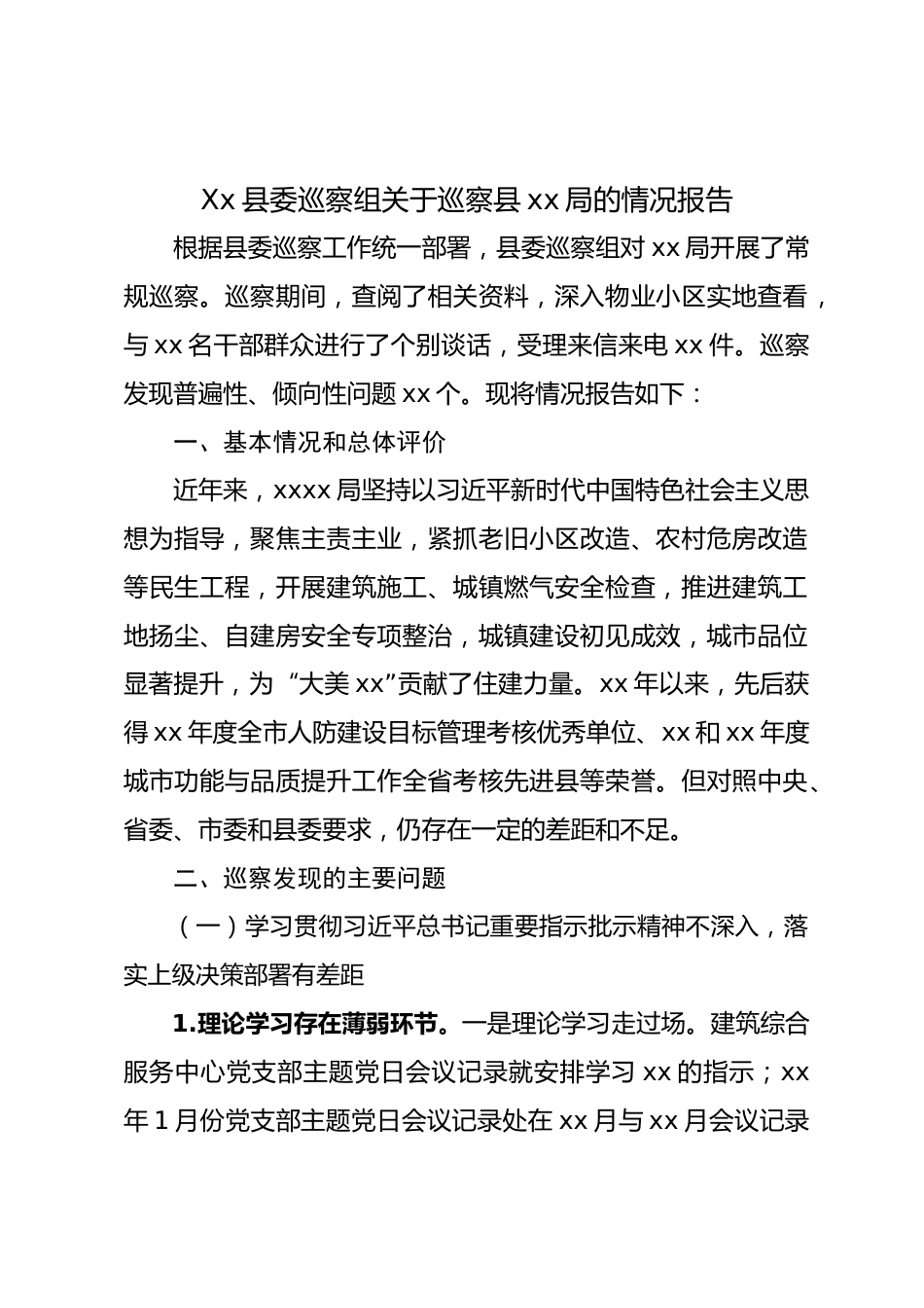Xx縣委巡察組關(guān)于巡察縣xx局的情況報告根據(jù)縣委巡察工作統(tǒng)一部署,縣委巡察組對xx局開展了常規(guī)巡察。巡察期間,查閱了相關(guān)資料,深入物業(yè)小區(qū)實地查看,與xx名干部群眾進(jìn)行了個別談話,受理來信來電xx件。巡察發(fā)現(xiàn)普遍性、傾向性問題xx個?,F(xiàn)將情況報告如下:一、基本情況和總體評價近年來,xxxx局堅持以習(xí)近平新時代中國特色社會主義思想為指導(dǎo),聚焦主責(zé)主業(yè),緊抓老舊小區(qū)改造、農(nóng)村危房改造等民生工程,開展建筑施工、城鎮(zhèn)燃?xì)獍踩珯z查,推進(jìn)建筑工地?fù)P塵、自建房安全專項整治,城鎮(zhèn)建設(shè)初見成效,城市品位顯著提升,為“大美xx”貢獻(xiàn)了住建力量。xx年以來,先后獲得...