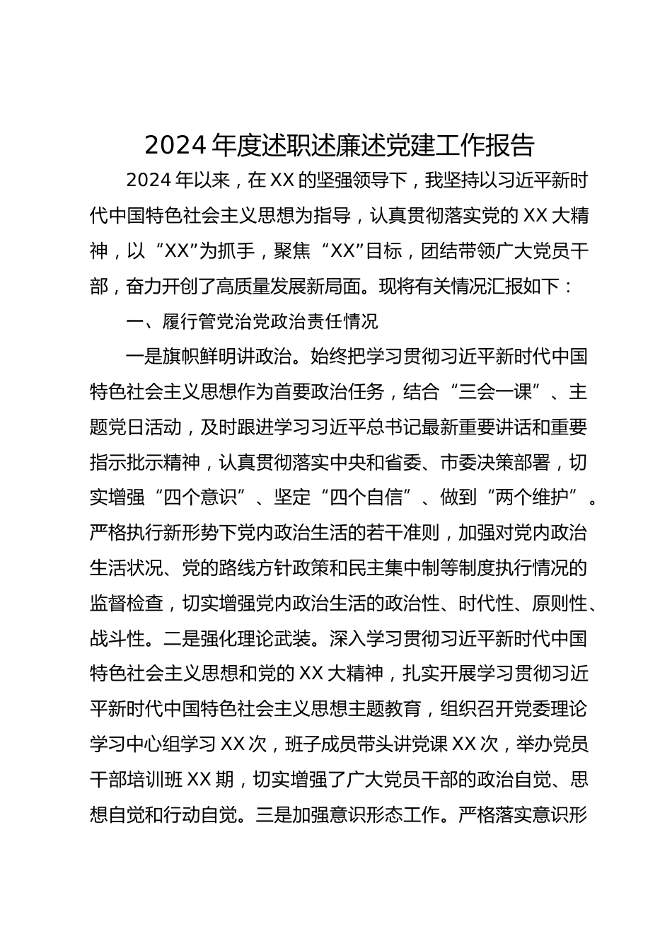 2024年度述職述廉述黨建工作報(bào)告2024年以來(lái),在XX的堅(jiān)強(qiáng)領(lǐng)導(dǎo)下,我堅(jiān)持以習(xí)近平新時(shí)代中國(guó)特色社會(huì)主義思想為指導(dǎo),認(rèn)真貫徹落實(shí)黨的XX大精神,以“XX”為抓手,聚焦“XX”目標(biāo),團(tuán)結(jié)帶領(lǐng)廣大黨員干部,奮力開(kāi)創(chuàng)了高質(zhì)量發(fā)展新局面?,F(xiàn)將有關(guān)情況匯報(bào)如下:一、履行管黨治黨政治責(zé)任情況一是旗幟鮮明講政治。始終把學(xué)習(xí)貫徹習(xí)近平新時(shí)代中國(guó)特色社會(huì)主義思想作為首要政治任務(wù),結(jié)合“三會(huì)一課”、主題黨日活動(dòng),及時(shí)跟進(jìn)學(xué)習(xí)習(xí)近平總書(shū)記最新重要講話和重要指示批示精神,認(rèn)真貫徹落實(shí)中央和省委、市委決策部署,切實(shí)增強(qiáng)“四個(gè)意識(shí)”、堅(jiān)定“四個(gè)自信”、做到“兩個(gè)維護(hù)...