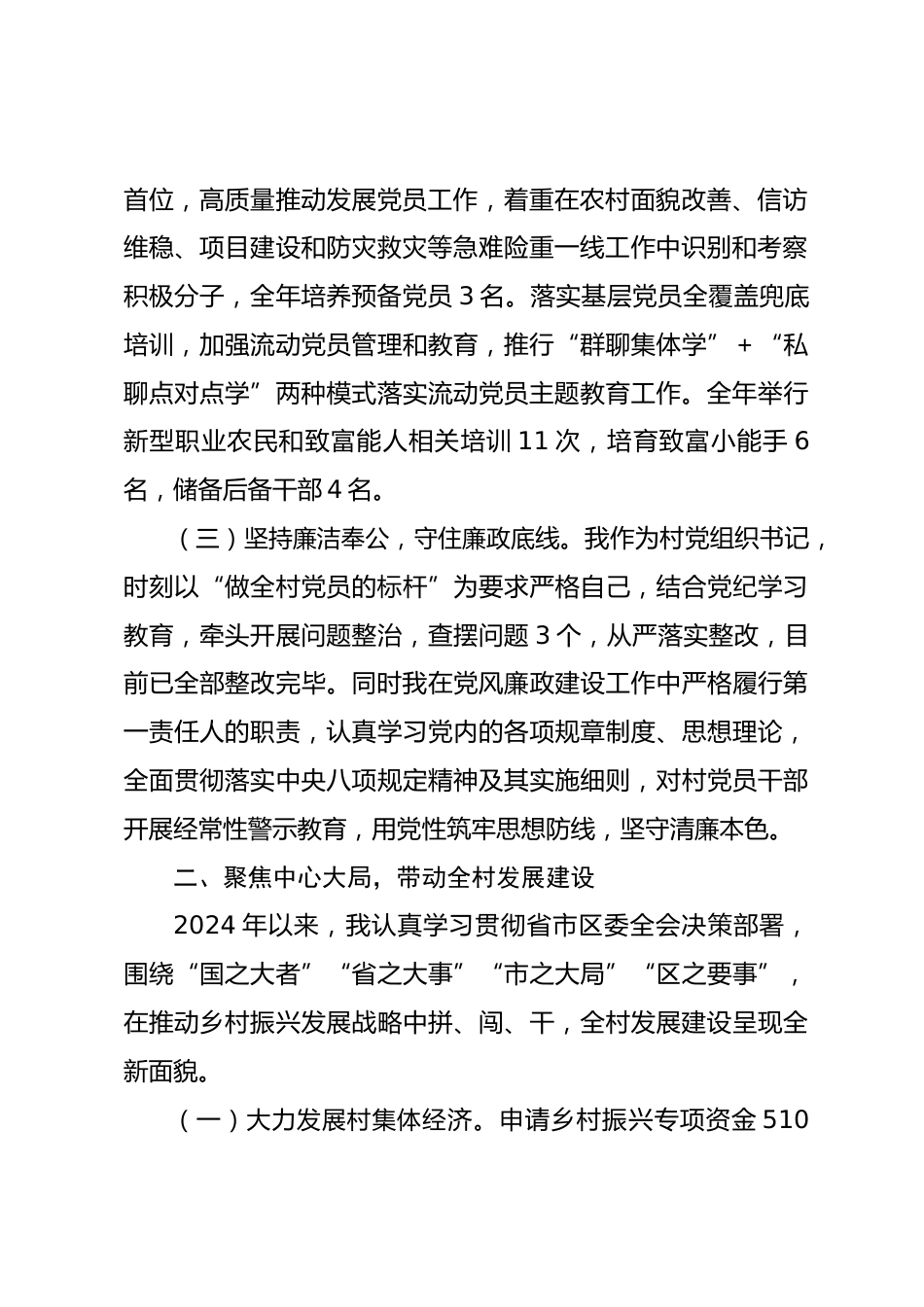 2024年度抓基層黨建工作述職報告22024年以來,我與村“兩委”在鄉(xiāng)黨委政府的關(guān)心指導(dǎo)下,在全村村民共同努力下,堅持政治上堅定向黨委政府靠攏,堅持發(fā)展上堅定向兄弟村社看齊,堅持民生上向高質(zhì)普惠發(fā)展,實現(xiàn)了全村政治更加穩(wěn)定、經(jīng)濟(jì)持續(xù)向好、生活更加幸福、民風(fēng)更加優(yōu)質(zhì)的全年任務(wù)目標(biāo),現(xiàn)將情況具體匯報如下。一、加強(qiáng)組織建設(shè),筑牢基層戰(zhàn)斗堡壘一年以來,作為村黨總支書記,我切實履行書記抓黨建、帶班子、強(qiáng)隊伍第一責(zé)任職責(zé),堅持用習(xí)近平新時代中國特色社會主義思想凝心鑄魂,持續(xù)增強(qiáng)班子的凝聚力、戰(zhàn)斗力。(一)堅持理論學(xué)習(xí),筑牢理想信念。在2024年,我...