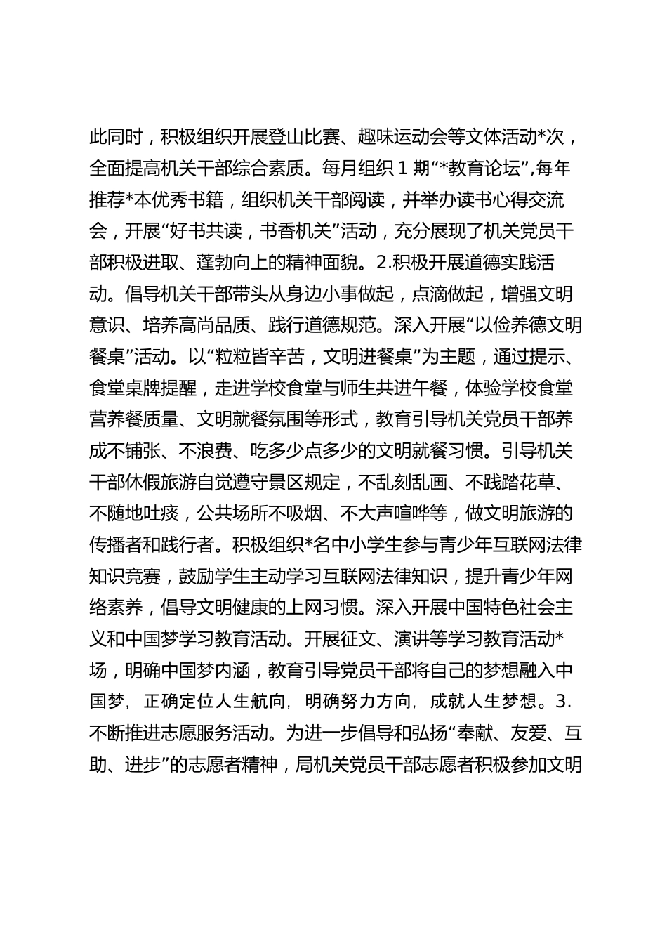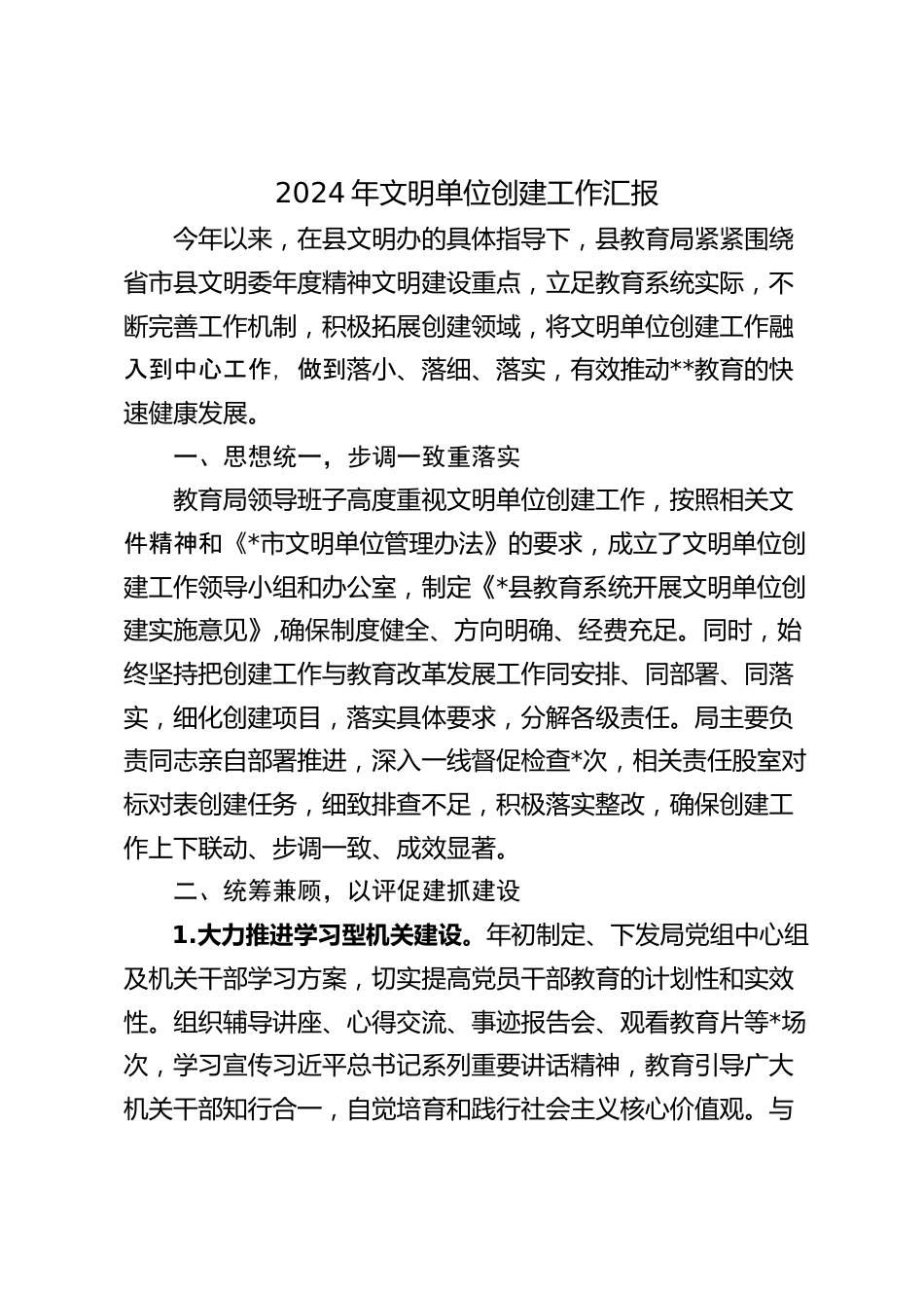 2024年文明單位創(chuàng)建工作匯報(bào)今年以來,在縣文明辦的具體指導(dǎo)下,縣教育局緊緊圍繞省市縣文明委年度精神文明建設(shè)重點(diǎn),立足教育系統(tǒng)實(shí)際,不斷完善工作機(jī)制,積極拓展創(chuàng)建領(lǐng)域,將文明單位創(chuàng)建工作融入到中心工作,做到落小、落細(xì)、落實(shí),有效推動(dòng)**教育的快速健康發(fā)展。一、思想統(tǒng)一,步調(diào)一致重落實(shí)教育局領(lǐng)導(dǎo)班子高度重視文明單位創(chuàng)建工作,按照相關(guān)文件精神和《*市文明單位管理辦法》的要求,成立了文明單位創(chuàng)建工作領(lǐng)導(dǎo)小組和辦公室,制定《*縣教育系統(tǒng)開展文明單位創(chuàng)建實(shí)施意見》,確保制度健全、方向明確、經(jīng)費(fèi)充足。同時(shí),始終堅(jiān)持把創(chuàng)建工作與教育改革發(fā)展工作同...