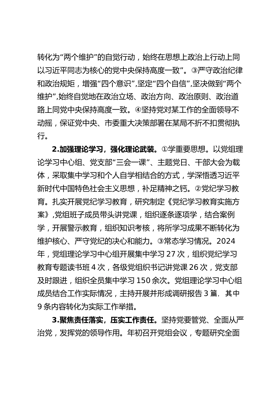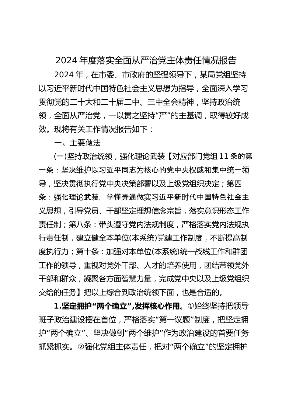 2024年度落實(shí)全面從嚴(yán)治黨主體責(zé)任情況報(bào)告2024年,在市委、市政府的堅(jiān)強(qiáng)領(lǐng)導(dǎo)下,某局黨組堅(jiān)持以習(xí)近平新時(shí)代中國(guó)特色社會(huì)主義思想為指導(dǎo),全面深入學(xué)習(xí)貫徹黨的二十大和二十屆二中、三中全會(huì)精神,堅(jiān)持政治統(tǒng)“”領(lǐng),全面從嚴(yán)治黨,一以貫之堅(jiān)持嚴(yán)的主基調(diào),取得較好成效。現(xiàn)將有關(guān)工作情況報(bào)告如下:一、主要做法(一)堅(jiān)持政治統(tǒng)領(lǐng),強(qiáng)化理論武裝【對(duì)應(yīng)部門(mén)黨組11條的第一條:決以近平同志核心的黨中央威和集中一堅(jiān)維護(hù)習(xí)為權(quán)統(tǒng)領(lǐng)導(dǎo),堅(jiān)決貫徹執(zhí)行黨中央決策部署以及上級(jí)黨組織決定;第四條:化理武裝,學(xué)懂弄通做近平新代中國(guó)特色社會(huì)主強(qiáng)論實(shí)習(xí)時(shí)義思想,引導(dǎo)黨員、干...