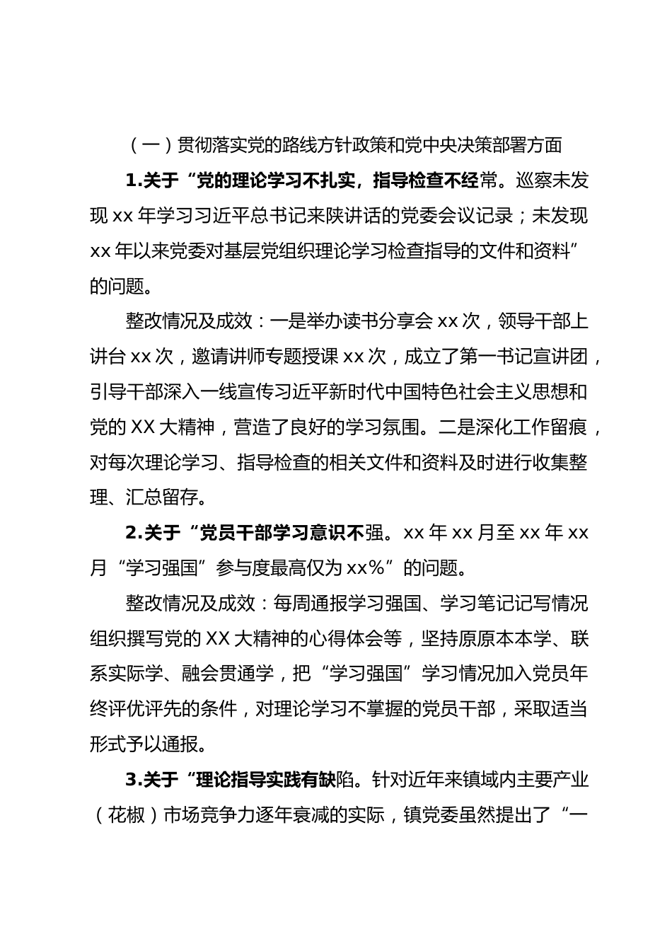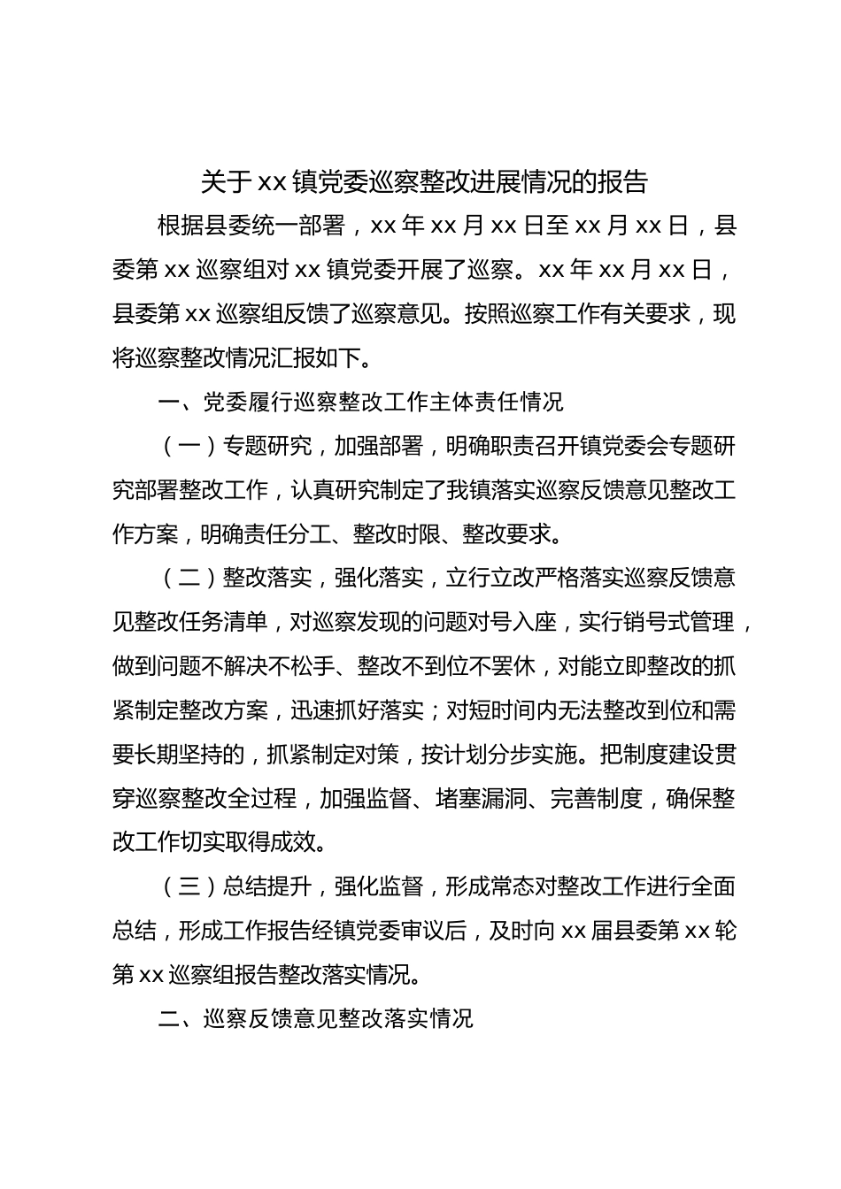 關(guān)于xx鎮(zhèn)黨委巡察整改進(jìn)展情況的報(bào)告根據(jù)縣委統(tǒng)一部署,xx年xx月xx日至xx月xx日,縣委第xx巡察組對(duì)xx鎮(zhèn)黨委開(kāi)展了巡察。xx年xx月xx日,縣委第xx巡察組反饋了巡察意見(jiàn)。按照巡察工作有關(guān)要求,現(xiàn)將巡察整改情況匯報(bào)如下。一、黨委履行巡察整改工作主體責(zé)任情況(一)專題研究,加強(qiáng)部署,明確職責(zé)召開(kāi)鎮(zhèn)黨委會(huì)專題研究部署整改工作,認(rèn)真研究制定了我鎮(zhèn)落實(shí)巡察反饋意見(jiàn)整改工作方案,明確責(zé)任分工、整改時(shí)限、整改要求。(二)整改落實(shí),強(qiáng)化落實(shí),立行立改嚴(yán)格落實(shí)巡察反饋意見(jiàn)整改任務(wù)清單,對(duì)巡察發(fā)現(xiàn)的問(wèn)題對(duì)號(hào)入座,實(shí)行銷號(hào)式管理,做到問(wèn)題不解決不松手、整改不到...
