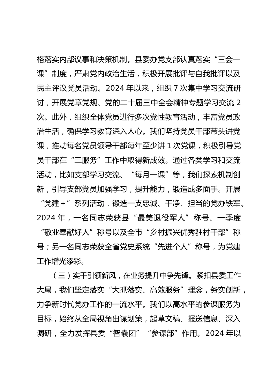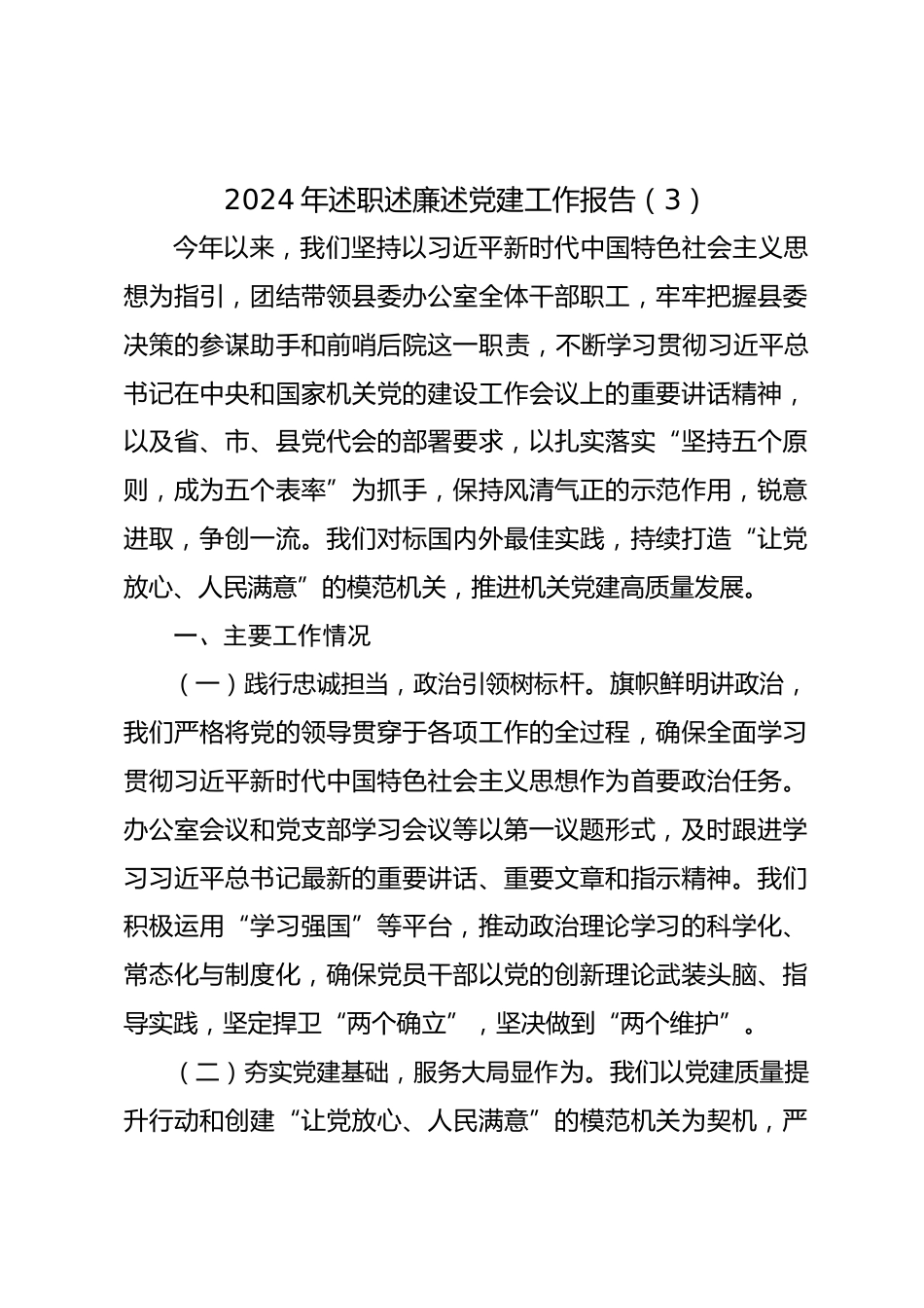 2024年述職述廉述黨建工作報告(3)今年以來,我們堅持以習(xí)近平新時代中國特色社會主義思想為指引,團結(jié)帶領(lǐng)縣委辦公室全體干部職工,牢牢把握縣委決策的參謀助手和前哨后院這一職責(zé),不斷學(xué)習(xí)貫徹習(xí)近平總書記在中央和國家機關(guān)黨的建設(shè)工作會議上的重要講話精神,以及省、市、縣黨代會的部署要求,以扎實落實“堅持五個原則,成為五個表率”為抓手,保持風(fēng)清氣正的示范作用,銳意進取,爭創(chuàng)一流。我們對標(biāo)國內(nèi)外最佳實踐,持續(xù)打造“讓黨放心、人民滿意”的模范機關(guān),推進機關(guān)黨建高質(zhì)量發(fā)展。一、主要工作情況(一)踐行忠誠擔(dān)當(dāng),政治引領(lǐng)樹標(biāo)桿。旗幟鮮明講政治,我...