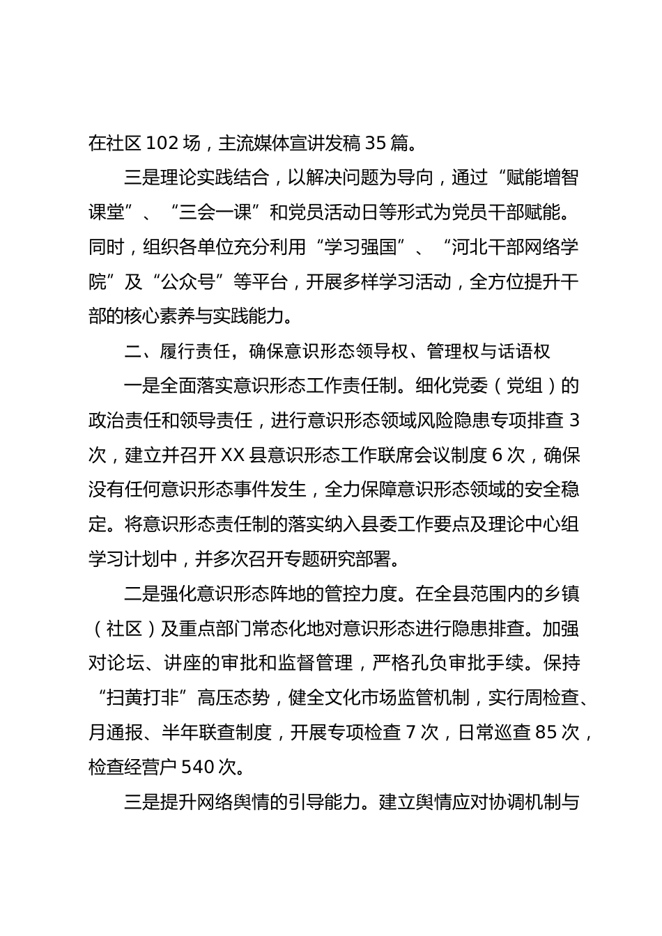 2024年度宣傳部領(lǐng)導(dǎo)班子總結(jié)報(bào)告2024年,縣委宣傳部堅(jiān)持以習(xí)近平新時(shí)代中國特色社會(huì)主義思想為指引,深刻學(xué)習(xí)貫徹黨的XX大及二十屆三中全會(huì)精神,精準(zhǔn)對(duì)標(biāo)省、市考評(píng)要求,加大在意識(shí)形態(tài)、理論武裝、新聞輿論、精神文明與文藝文化五個(gè)核心領(lǐng)域的戰(zhàn)略投入,持續(xù)提升黨的建設(shè),堅(jiān)定不移地為XX的高質(zhì)量發(fā)展新篇章提供堅(jiān)實(shí)的思想保障和強(qiáng)大的精神動(dòng)力。一、以學(xué)促用,堅(jiān)定不移地用習(xí)近平新時(shí)代中國特色社會(huì)主義思想培根鑄魂一是著抓好關(guān)鍵少數(shù),強(qiáng)調(diào)思想引領(lǐng)。深入貫徹習(xí)近平文化思想,嚴(yán)格落實(shí)《中國共產(chǎn)黨黨委(黨組)理論學(xué)習(xí)中心組學(xué)習(xí)規(guī)則》。截至目前,縣委理論學(xué)習(xí)中...