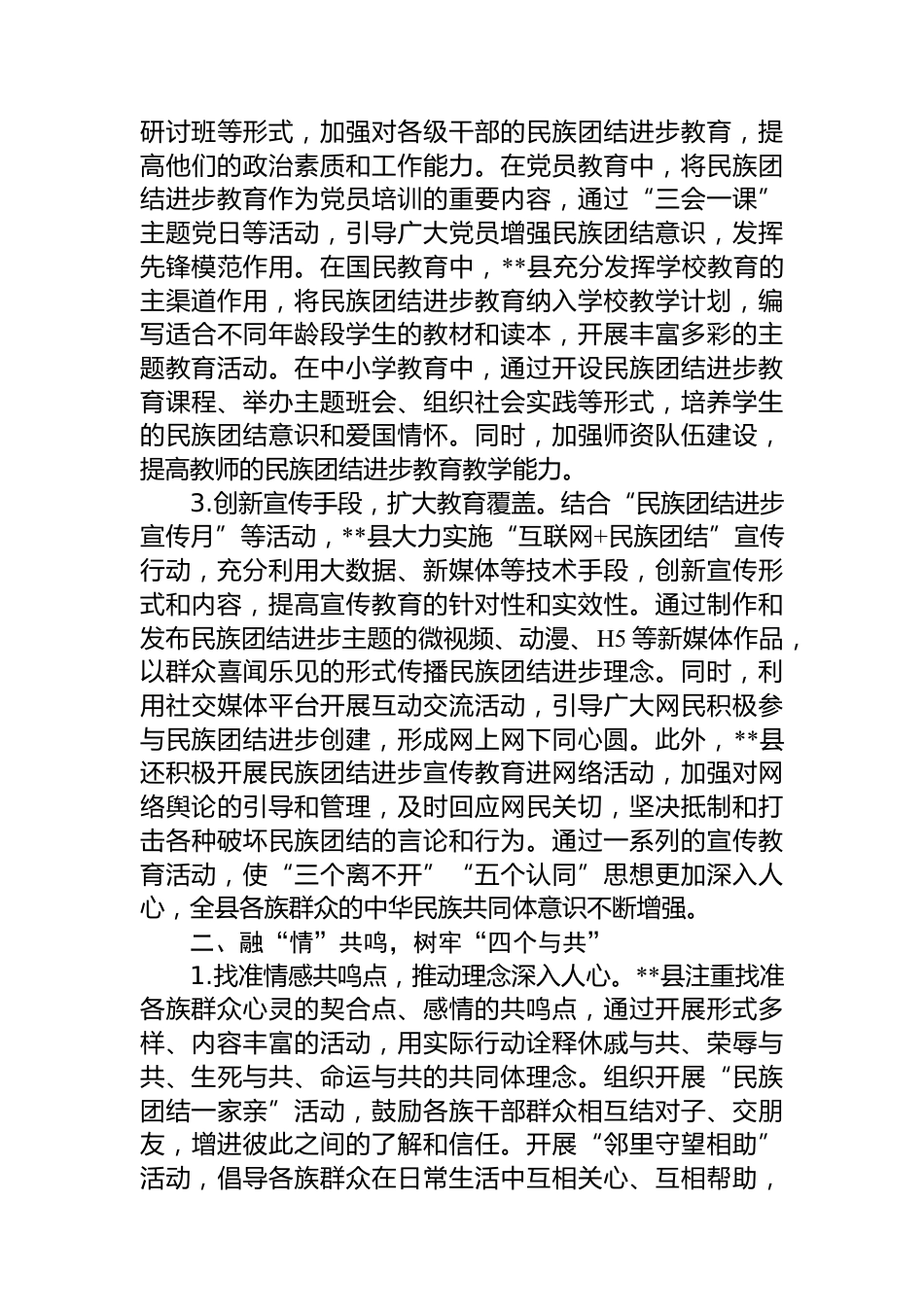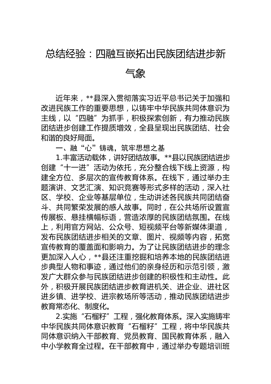 總結(jié)經(jīng)驗:四融互嵌拓出民族團結(jié)進步新氣象近年來,**縣深入貫徹落實習(xí)近平總書記關(guān)于加強和改進民族工作的重要思想,以鑄牢中華民族共同體意識為主線,以“四融”為抓手,積極探索創(chuàng)新,有力推動民族團結(jié)進步創(chuàng)建工作提質(zhì)增效,全縣呈現(xiàn)出民族團結(jié)、社會和諧的良好局面。一、融“心”鑄魂,筑牢思想之基1.豐富活動載體,講好團結(jié)故事。**縣以民族團結(jié)進步創(chuàng)建“十一進”活動為依托,充分整合線下線上資源,構(gòu)建全方位、多層次的宣傳教育體系。在線下,通過舉辦主題演講、文藝匯演、知識競賽等形式多樣的活動,深入社區(qū)、學(xué)校、企業(yè)等基層單位,生動講述各民族共同團結(jié)奮...