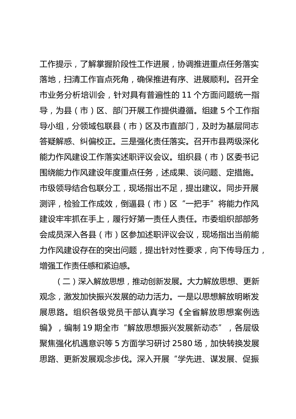 市級(jí)能力作風(fēng)建設(shè)情況報(bào)告年初以來(lái),我市全面貫徹落實(shí)省委深化能力作風(fēng)建設(shè)工作部署,把開(kāi)展“抓基層、打基礎(chǔ)、強(qiáng)落實(shí)、見(jiàn)實(shí)效”活動(dòng)作為加力推動(dòng)中國(guó)式現(xiàn)代化XX實(shí)踐的重要載體,一以貫之提能力、轉(zhuǎn)作風(fēng)、抓落實(shí),廣大黨員干部思想觀念持續(xù)解放,能力素質(zhì)明顯提升,工作作風(fēng)不斷優(yōu)化,基層基礎(chǔ)進(jìn)一步夯實(shí),為全市經(jīng)濟(jì)社會(huì)發(fā)展提供堅(jiān)強(qiáng)保障。一、2024年工作開(kāi)展情況(一)堅(jiān)持高位推動(dòng),全面加強(qiáng)組織保障。市委深入研究謀劃、高標(biāo)準(zhǔn)組織開(kāi)展、高質(zhì)效強(qiáng)力推進(jìn)能力作風(fēng)建設(shè)工作,確保各項(xiàng)任務(wù)落到實(shí)處、見(jiàn)到實(shí)效。一是強(qiáng)化組織領(lǐng)導(dǎo)。市委主要領(lǐng)導(dǎo)堅(jiān)持以上率下、高位推動(dòng),主...