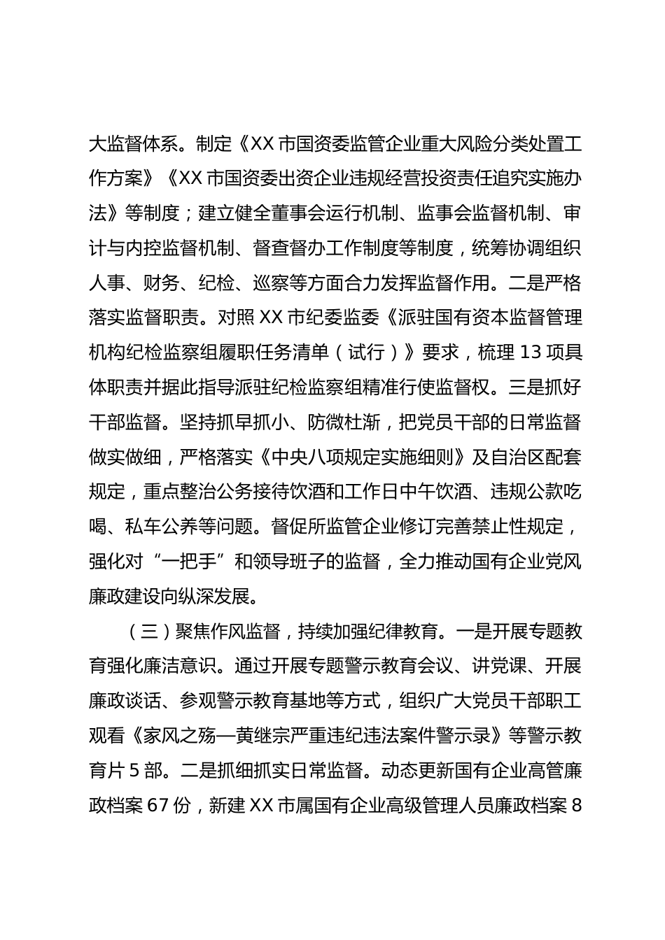 市國(guó)資委黨委2024年黨風(fēng)廉政建設(shè)工作情況報(bào)告一、工作開展情況(一)聚焦政治監(jiān)督,有力推進(jìn)上級(jí)決策實(shí)施。一是把牢政治方向。嚴(yán)格落實(shí)全面從嚴(yán)治黨主體責(zé)任,定期研究部署黨風(fēng)廉政建設(shè)工作,認(rèn)真貫徹落實(shí)市委市政府關(guān)于黨風(fēng)廉政建設(shè)的工作安排,制定印發(fā)《XX市國(guó)資系統(tǒng)2024年黨風(fēng)廉政建設(shè)和反腐敗工作要點(diǎn)》《XX市國(guó)資系統(tǒng)開展紀(jì)檢監(jiān)察干部隊(duì)伍建設(shè)專項(xiàng)活動(dòng)實(shí)施方案》《XX市國(guó)資系統(tǒng)黨風(fēng)廉政建設(shè)“清廉國(guó)企”建設(shè)責(zé)任清單》等文件,堅(jiān)持把加強(qiáng)黨的領(lǐng)導(dǎo)貫穿到國(guó)資國(guó)企改革發(fā)展全過程各方面。二是學(xué)深悟透黨的創(chuàng)新理論強(qiáng)化思想武裝。嚴(yán)格落實(shí)第一議題制度,深入開展“大學(xué)...