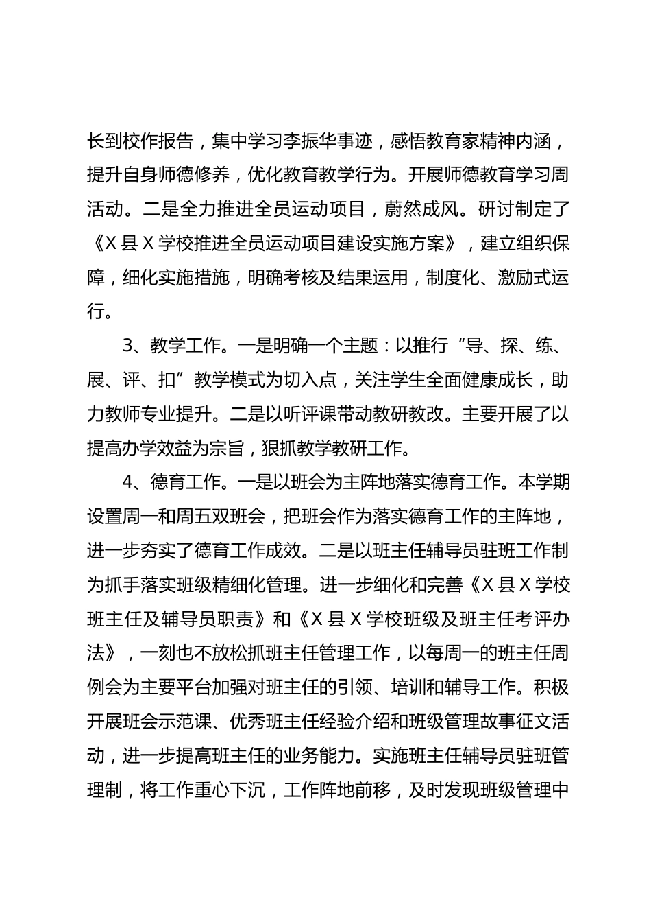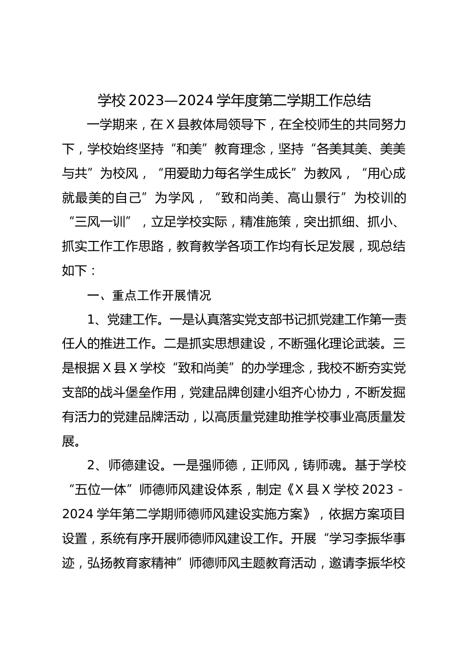 學(xué)校2023—2024學(xué)年度第二學(xué)期工作總結(jié)一學(xué)期來,在X縣教體局領(lǐng)導(dǎo)下,在全校師生的共同努力下,學(xué)校始終堅(jiān)持“和美”教育理念,堅(jiān)持“各美其美、美美與共”為校風(fēng),“用愛助力每名學(xué)生成長”為教風(fēng),“用心成就最美的自己”為學(xué)風(fēng),“致和尚美、高山景行”為校訓(xùn)的“三風(fēng)一訓(xùn)”,立足學(xué)校實(shí)際,精準(zhǔn)施策,突出抓細(xì)、抓小、抓實(shí)工作工作思路,教育教學(xué)各項(xiàng)工作均有長足發(fā)展,現(xiàn)總結(jié)如下:一、重點(diǎn)工作開展情況1、黨建工作。一是認(rèn)真落實(shí)黨支部書記抓黨建工作第一責(zé)任人的推進(jìn)工作。二是抓實(shí)思想建設(shè),不斷強(qiáng)化理論武裝。三是根據(jù)X縣X學(xué)?!爸潞蜕忻馈钡霓k學(xué)理念,我校不斷...