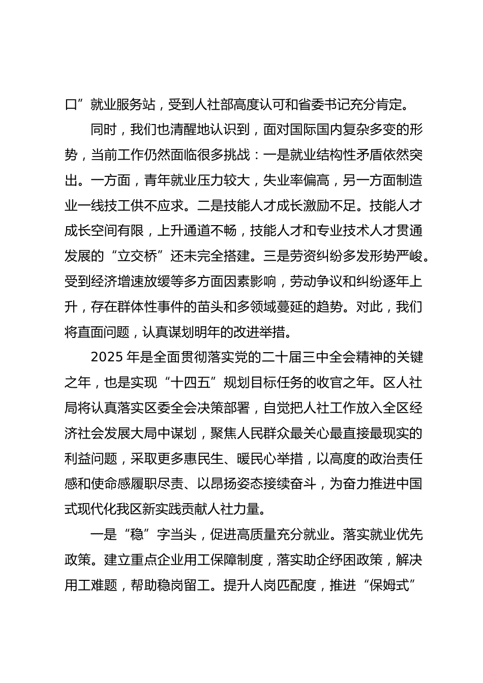 人社系統(tǒng)2025年務虛會講話稿2024年,區(qū)人社局始終高舉習近平新時代中國特色社會主義思想偉大旗幟,深入學習貫徹黨的二十大和二十屆二中、三中全會精神,緊緊圍繞區(qū)域現代化高質量發(fā)展總體布局,牢牢抓住就業(yè)這一最基本的民生,服務“新質生產力特色高地、高質量發(fā)展活力強區(qū)”建設,持續(xù)完善社會保障體系,筑牢民生底線,全面完成各項目標任務。我們堅持就業(yè)優(yōu)先,就業(yè)創(chuàng)業(yè)工作展現新作為。開展招聘活動*場,提供崗位*萬個,實現城鎮(zhèn)新增就業(yè)*人,支持成功自主創(chuàng)業(yè)*人。在全市率先實現創(chuàng)業(yè)、就業(yè)、企業(yè)項目制培訓“大滿貫”。堅持民生為本,社會保障水平得到新提升。穩(wěn)妥...
