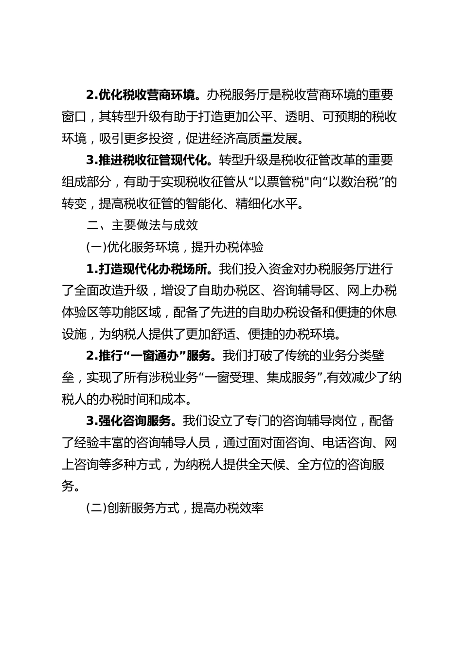 某市稅務(wù)局關(guān)于辦稅服務(wù)廳轉(zhuǎn)型升級(jí)的工作匯報(bào)尊敬的各位領(lǐng)導(dǎo)、同事們:大家好!今天,我非常榮幸地向大家匯報(bào)我局辦稅服務(wù)廳轉(zhuǎn)型升級(jí)工作的進(jìn)展情況。在市局黨委的堅(jiān)強(qiáng)領(lǐng)導(dǎo)下,在各級(jí)各部門的“”大力支持下,我們緊密圍繞便民、高效、規(guī)范、廉潔的服務(wù)宗旨,以納稅人需求為導(dǎo)向,以優(yōu)化稅收營(yíng)商環(huán)境為目標(biāo),積極推進(jìn)辦稅服務(wù)廳轉(zhuǎn)型升級(jí),取得了顯著成效。下面,我將從以下幾個(gè)方面進(jìn)行匯報(bào):一、工作背景與重要意義(一)工作背景隨著經(jīng)濟(jì)社會(huì)的快速發(fā)展和稅收征管改革的不斷深入,傳統(tǒng)的辦稅服務(wù)廳面臨著諸多挑戰(zhàn)。一方面,納稅人數(shù)量不斷增加,業(yè)務(wù)需求日益多樣化、個(gè)性...