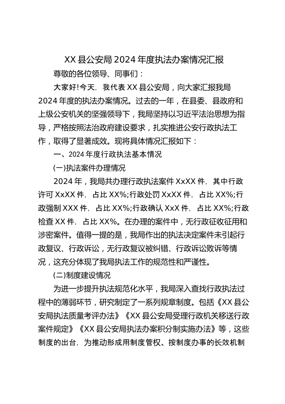 XX縣公安局2024年度執(zhí)法辦案情況匯報(bào)尊敬的各位領(lǐng)導(dǎo)、同事們:大家好!今天,我代表XX縣公安局,向大家匯報(bào)我局2024年度的執(zhí)法辦案情況。過(guò)去的一年,在縣委、縣政府和上級(jí)公安機(jī)關(guān)的堅(jiān)強(qiáng)領(lǐng)導(dǎo)下,我局堅(jiān)持以習(xí)近平法治思想為指導(dǎo),嚴(yán)格按照法治政府建設(shè)要求,扎實(shí)推進(jìn)公安行政執(zhí)法工作,取得了顯著成效?,F(xiàn)將具體情況匯報(bào)如下:一、2024年度行政執(zhí)法基本情況(一)執(zhí)法案件辦理情況2024年,我局共辦理行政執(zhí)法案件XxXX件,其中行政許可XxXX件,占比XX%;行政處罰XxXX件,占比XX%;行政強(qiáng)制XXX件,占比XX%;行政確認(rèn)XxX件,占比XX%;行政檢查XX件,占比XX%。在辦理的案件中,無(wú)行...