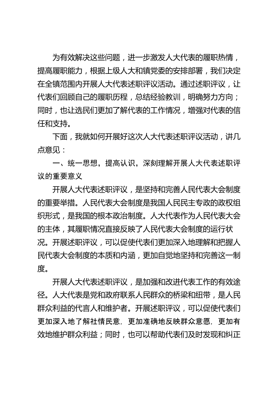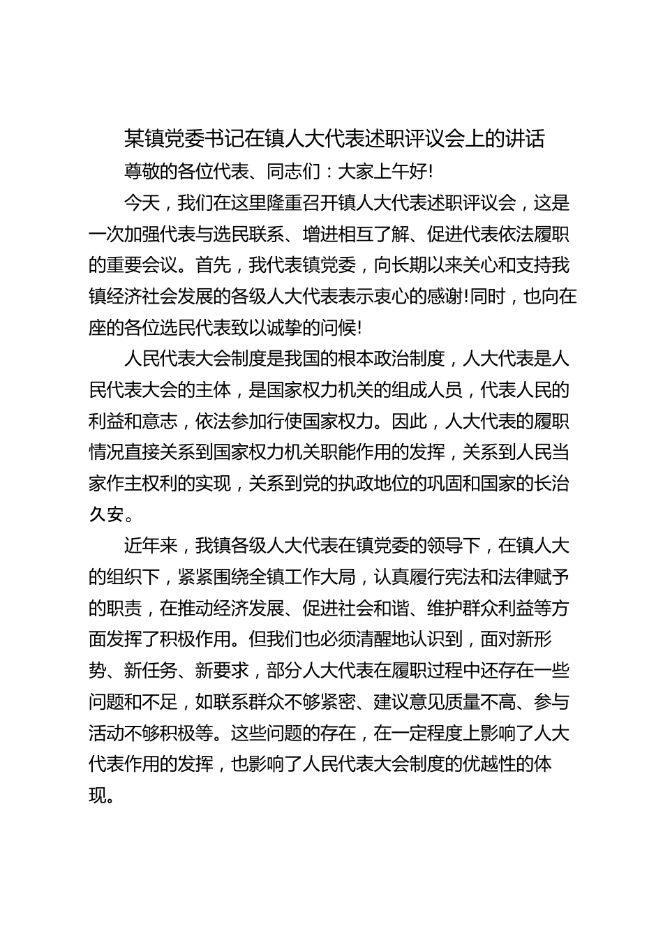 某鎮(zhèn)黨委書記在鎮(zhèn)人大代表述職評(píng)議會(huì)上的講話尊敬的各位代表、同志們:大家上午好!今天,我們?cè)谶@里隆重召開(kāi)鎮(zhèn)人大代表述職評(píng)議會(huì),這是一次加強(qiáng)代表與選民聯(lián)系、增進(jìn)相互了解、促進(jìn)代表依法履職的重要會(huì)議。首先,我代表鎮(zhèn)黨委,向長(zhǎng)期以來(lái)關(guān)心和支持我鎮(zhèn)經(jīng)濟(jì)社會(huì)發(fā)展的各級(jí)人大代表表示衷心的感謝!同時(shí),也向在座的各位選民代表致以誠(chéng)摯的問(wèn)候!人民代表大會(huì)制度是我國(guó)的根本政治制度,人大代表是人民代表大會(huì)的主體,是國(guó)家權(quán)力機(jī)關(guān)的組成人員,代表人民的利益和意志,依法參加行使國(guó)家權(quán)力。因此,人大代表的履職情況直接關(guān)系到國(guó)家權(quán)力機(jī)關(guān)職能作用的發(fā)揮,關(guān)系到人...