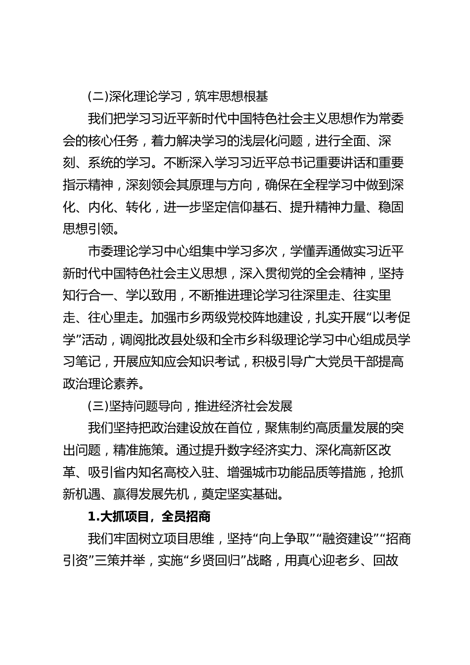 某市委常委會(huì)工作報(bào)告尊敬的各位領(lǐng)導(dǎo)、各位代表、同志們:現(xiàn)在,我代表市委常委會(huì),向大會(huì)報(bào)告工作,請(qǐng)予審議。一、總體工作回顧在過(guò)去的一年里,我們市委常委會(huì)在中央、省委的堅(jiān)強(qiáng)領(lǐng)導(dǎo)下,始終堅(jiān)持以習(xí)近平新時(shí)代中國(guó)特色社會(huì)主義思想為指導(dǎo),全面學(xué)習(xí)貫徹黨的十九大和歷次全會(huì)精神,緊盯區(qū)域中心城市、副中心城市建設(shè)目標(biāo),堅(jiān)持以黨的建設(shè)高質(zhì)量推動(dòng)經(jīng)濟(jì)發(fā)展高質(zhì)量,統(tǒng)籌推進(jìn)疫情防控和經(jīng)濟(jì)社會(huì)發(fā)展,各項(xiàng)工作取得了顯著成效。(一)加強(qiáng)黨的全面領(lǐng)導(dǎo),夯實(shí)高質(zhì)量發(fā)展基礎(chǔ)市委常委會(huì)旗幟鮮明講政治,強(qiáng)化黨建主責(zé)主業(yè)意識(shí),切“實(shí)把增強(qiáng)四個(gè)意識(shí)"“、堅(jiān)定四個(gè)自信"“”、...