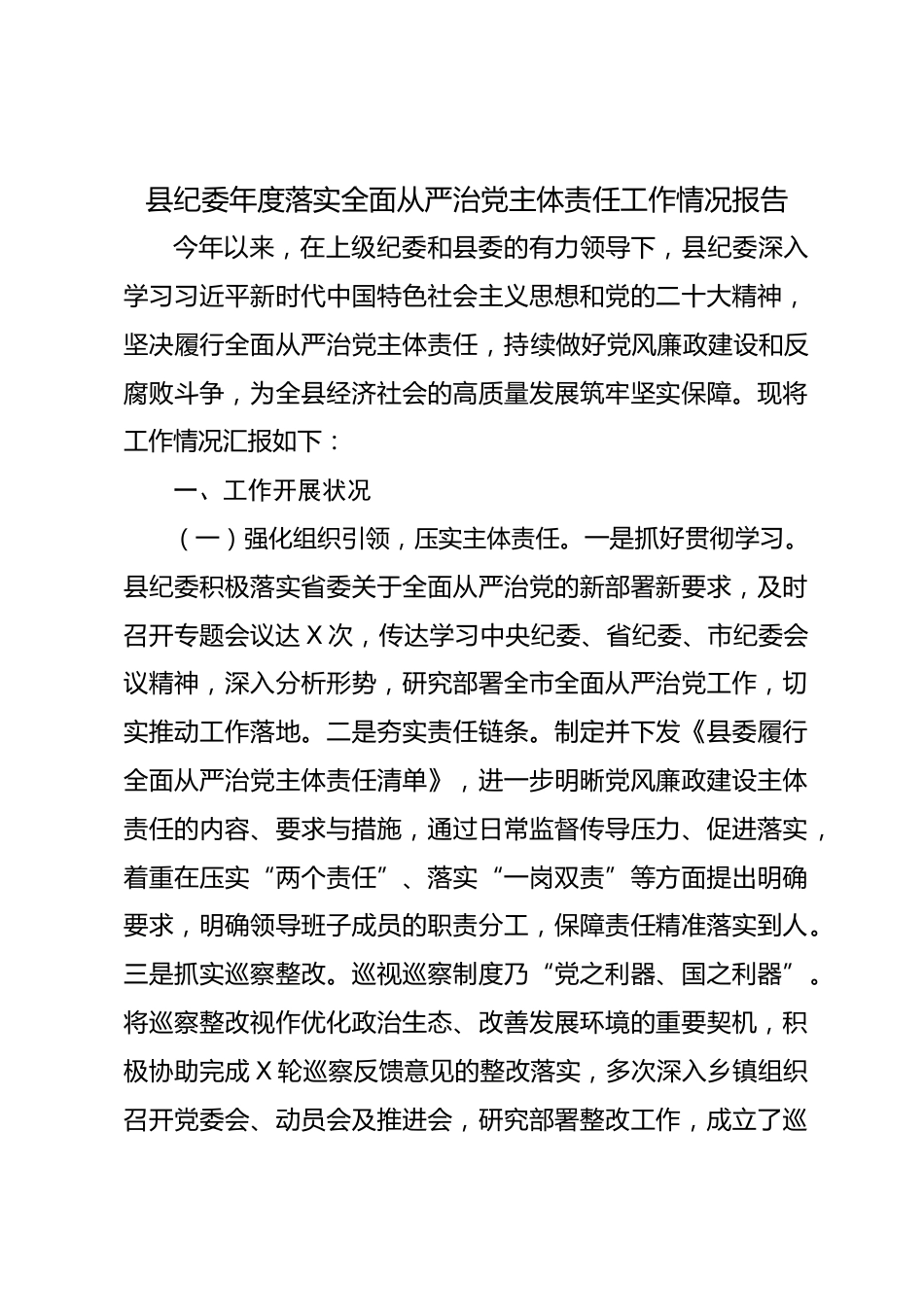 2024年縣紀(jì)委年度落實(shí)全面從嚴(yán)治黨主體責(zé)任工作情況報(bào)告VIP免費(fèi)