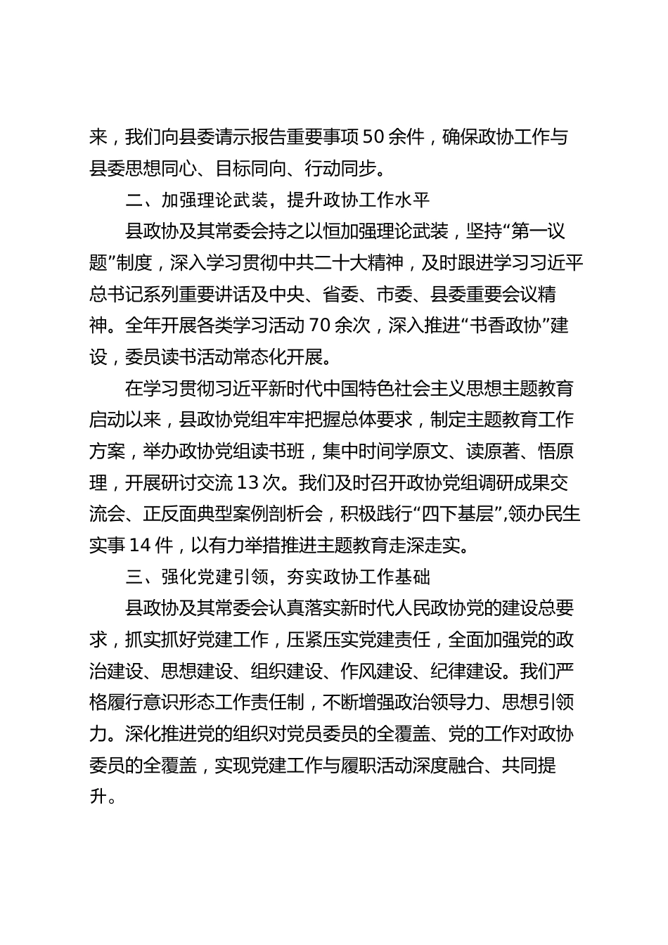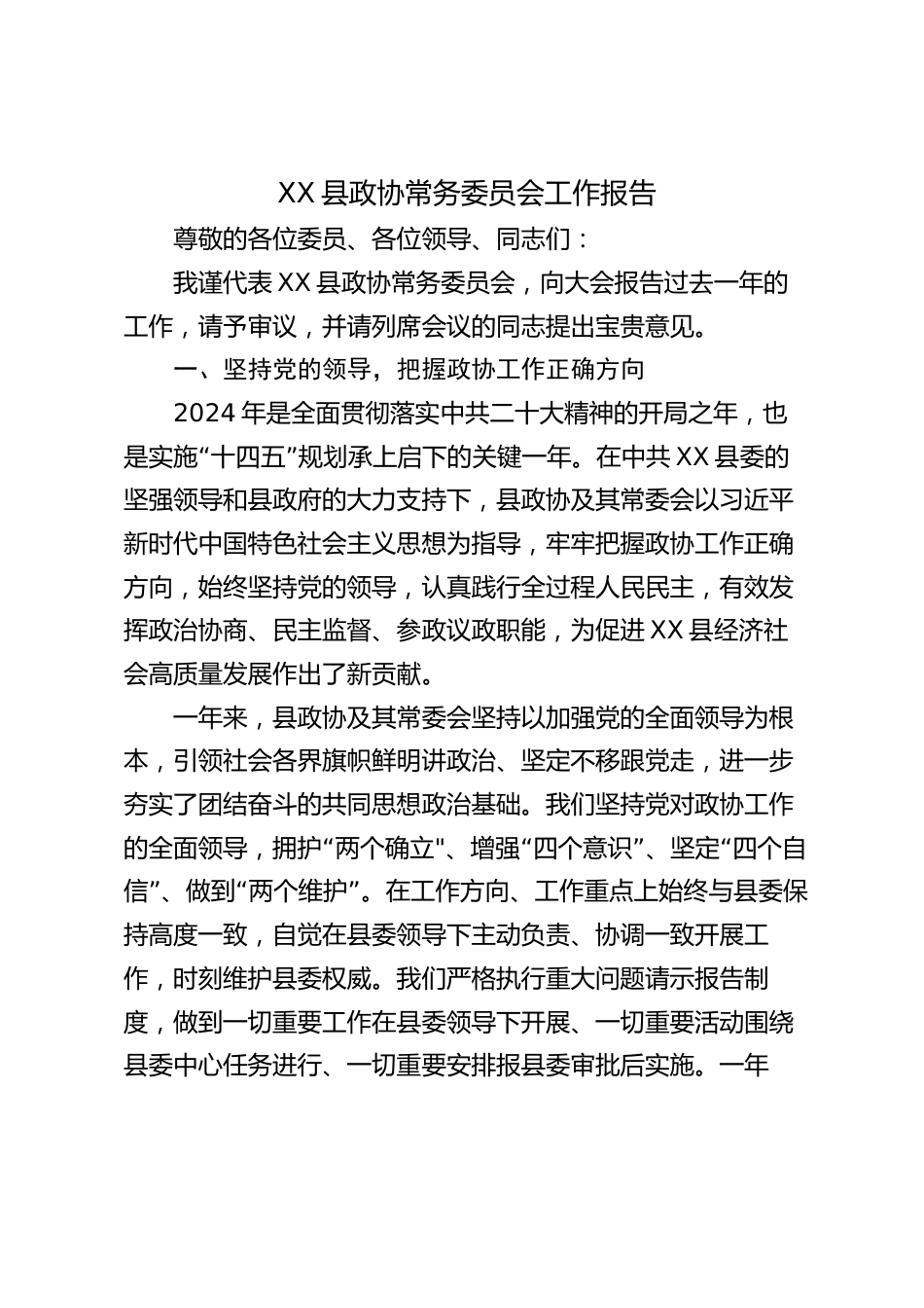 XX縣政協(xié)常務(wù)委員會(huì)工作報(bào)告尊敬的各位委員、各位領(lǐng)導(dǎo)、同志們:我謹(jǐn)代表XX縣政協(xié)常務(wù)委員會(huì),向大會(huì)報(bào)告過去一年的工作,請(qǐng)予審議,并請(qǐng)列席會(huì)議的同志提出寶貴意見。一、堅(jiān)持黨的領(lǐng)導(dǎo),把握政協(xié)工作正確方向2024年是全面貫徹落實(shí)中共二十大精神的開局之年,也“”是實(shí)施十四五規(guī)劃承上啟下的關(guān)鍵一年。在中共XX縣委的堅(jiān)強(qiáng)領(lǐng)導(dǎo)和縣政府的大力支持下,縣政協(xié)及其常委會(huì)以習(xí)近平新時(shí)代中國(guó)特色社會(huì)主義思想為指導(dǎo),牢牢把握政協(xié)工作正確方向,始終堅(jiān)持黨的領(lǐng)導(dǎo),認(rèn)真踐行全過程人民民主,有效發(fā)揮政治協(xié)商、民主監(jiān)督、參政議政職能,為促進(jìn)XX縣經(jīng)濟(jì)社會(huì)高質(zhì)量發(fā)展作出了新...