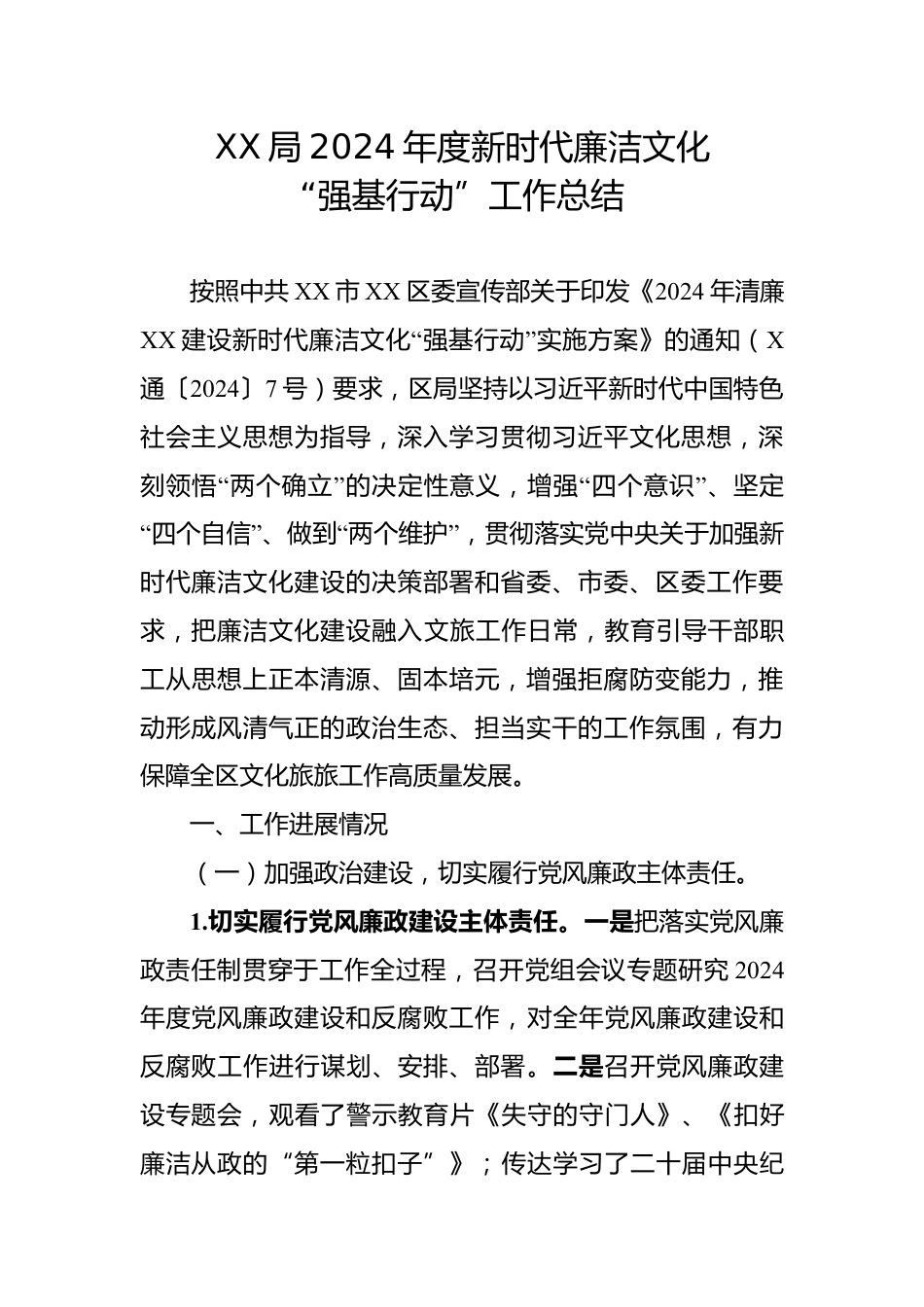 XX局2024年度新時(shí)代廉潔文化“強(qiáng)基行動(dòng)”工作總結(jié)按照中共XX市XX區(qū)委宣傳部關(guān)于印發(fā)《2024年清廉XX建設(shè)新時(shí)代廉潔文化“強(qiáng)基行動(dòng)”實(shí)施方案》的通知(X通〔2024〕7號(hào))要求,區(qū)局堅(jiān)持以習(xí)近平新時(shí)代中國(guó)特色社會(huì)主義思想為指導(dǎo),深入學(xué)習(xí)貫徹習(xí)近平文化思想,深刻領(lǐng)悟“兩個(gè)確立”的決定性意義,增強(qiáng)“四個(gè)意識(shí)”、堅(jiān)定“四個(gè)自信”、做到“兩個(gè)維護(hù)”,貫徹落實(shí)黨中央關(guān)于加強(qiáng)新時(shí)代廉潔文化建設(shè)的決策部署和省委、市委、區(qū)委工作要求,把廉潔文化建設(shè)融入文旅工作日常,教育引導(dǎo)干部職工從思想上正本清源、固本培元,增強(qiáng)拒腐防變能力,推動(dòng)形成風(fēng)清氣正的政治生態(tài)、擔(dān)...