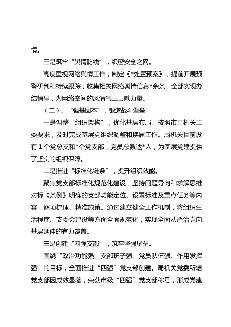 大領(lǐng)導(dǎo)2024年抓基層黨建述職報(bào)告2024年以來(lái),在市委的堅(jiān)強(qiáng)領(lǐng)導(dǎo)下,本人堅(jiān)持*思想為指引,深入貫徹黨的*、全會(huì)精神,嚴(yán)格落實(shí)管黨治黨主體責(zé)任,扎實(shí)履行“第一責(zé)任人”職責(zé)。以打造“清廉機(jī)關(guān)”為目標(biāo),以推動(dòng)黨支部標(biāo)準(zhǔn)化、規(guī)范化建設(shè)為抓手,堅(jiān)持把抓實(shí)抓好黨建工作視為最大的政績(jī),以黨建“牛鼻子”牽引全局,全面推動(dòng)基層黨建工作呈現(xiàn)“新氣象”?,F(xiàn)述職如下:一、主要工作情況及成效(一)“首題領(lǐng)航”,筑牢政治根基一是強(qiáng)化“政治羅盤”,堅(jiān)定信仰之基。嚴(yán)格落實(shí)“第一議題”制度。今年以來(lái),我始終將學(xué)習(xí)*重要講話和指示批示精神作為首要任務(wù),主持局黨組會(huì)議專...
