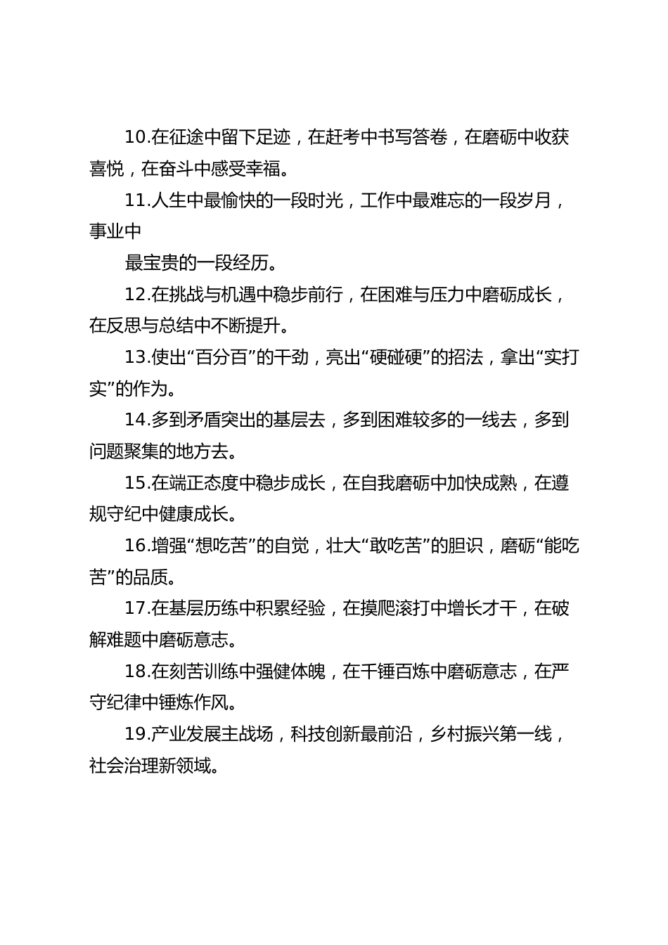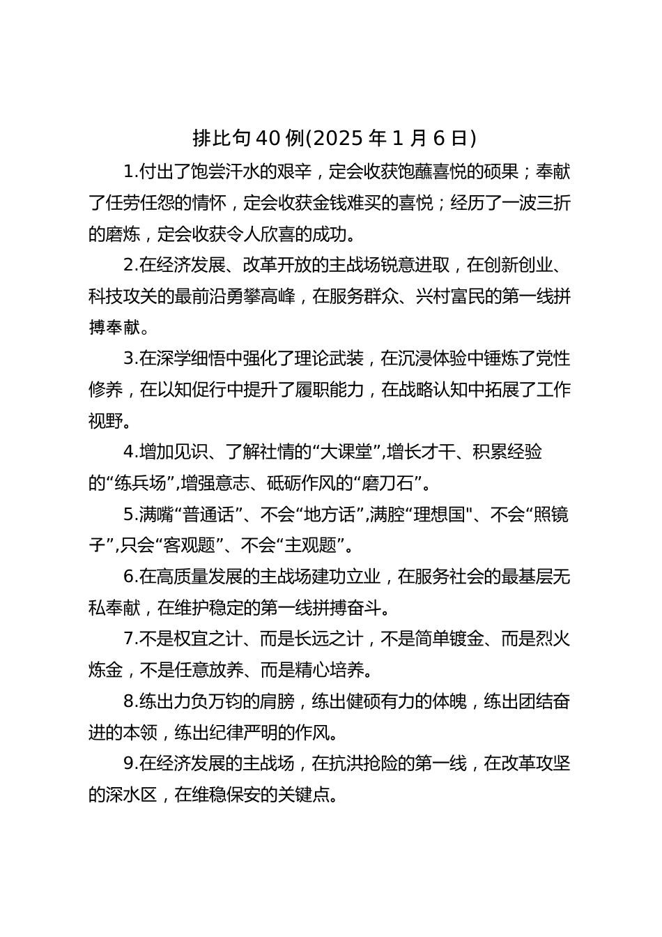 排比句40例(2025年1月6日)1.付出了飽嘗汗水的艱辛,定會(huì)收獲飽蘸喜悅的碩果;奉獻(xiàn)了任勞任怨的情懷,定會(huì)收獲金錢難買的喜悅;經(jīng)歷了一波三折的磨煉,定會(huì)收獲令人欣喜的成功。2.在經(jīng)濟(jì)發(fā)展、改革開放的主戰(zhàn)場(chǎng)銳意進(jìn)取,在創(chuàng)新創(chuàng)業(yè)、科技攻關(guān)的最前沿勇攀高峰,在服務(wù)群眾、興村富民的第一線拼搏奉獻(xiàn)。3.在深學(xué)細(xì)悟中強(qiáng)化了理論武裝,在沉浸體驗(yàn)中錘煉了黨性修養(yǎng),在以知促行中提升了履職能力,在戰(zhàn)略認(rèn)知中拓展了工作視野。4.“”增加見識(shí)、了解社情的大課堂,增長(zhǎng)才干、積累經(jīng)驗(yàn)“”的練兵場(chǎng),“”增強(qiáng)意志、砥礪作風(fēng)的磨刀石。5.“”“”滿嘴普通話、不會(huì)地方話,“滿腔...
