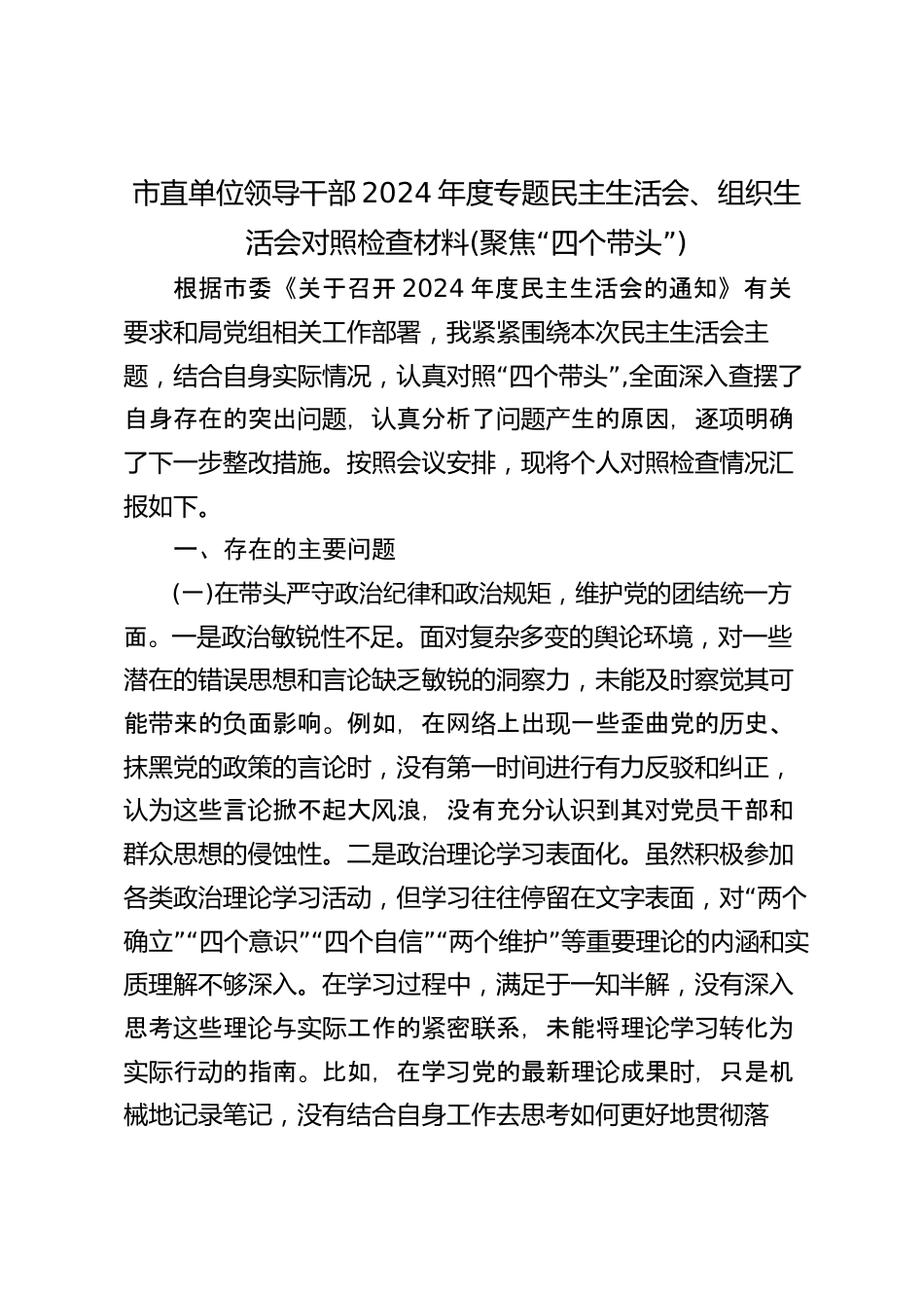 市直單位領(lǐng)導(dǎo)干部2024年度專題民主生活會、組織生活會對照檢查材料(聚焦“四個帶頭”)VIP免費