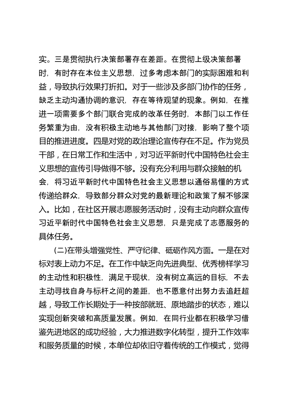 市直單位領(lǐng)導(dǎo)干部2024年度專題民主生活會、組織生活會對照檢查材料(“”聚焦四個帶頭)根據(jù)市委《關(guān)于召開2024年度民主生活會的通知》有關(guān)要求和局黨組相關(guān)工作部署,我緊緊圍繞本次民主生活會主“”題,結(jié)合自身實際情況,認真對照四個帶頭,全面深入查擺了自身存在的突出,真分析了生的原因,逐明確問題認問題產(chǎn)項了下一步整改措施。按照會議安排,現(xiàn)將個人對照檢查情況匯報如下。一、存在的主要問題(一)在帶頭嚴守政治紀律和政治規(guī)矩,維護黨的團結(jié)統(tǒng)一方面。一是政治敏銳性不足。面對復(fù)雜多變的輿論環(huán)境,對一些潛在的錯誤思想和言論缺乏敏銳的洞察力,未能及時察覺其...