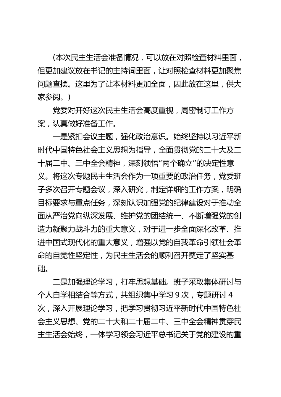2024年度領(lǐng)導(dǎo)班子民主生活會(huì)對(duì)照檢查材料根據(jù)上級(jí)黨委關(guān)于開(kāi)好2024年度黨員領(lǐng)導(dǎo)干部民主生活會(huì)的有關(guān)要求,單位黨委班子聚焦本次民主生活會(huì)主題,按“”照四個(gè)帶頭的要求系統(tǒng)梳理查擺問(wèn)題,深入剖析違紀(jì)違法案例,深刻分析思想根源,制定問(wèn)題整改措施。現(xiàn)將對(duì)照檢查情況報(bào)告如下。一、上年度常委班子主題教育專題民主生活會(huì)整改落實(shí)情況(上年度常委班子民主生活會(huì)整改落實(shí)情況屬于必須報(bào)告的內(nèi)容,一般采取書面報(bào)告的方式,印發(fā)會(huì)議。有的同學(xué)詢問(wèn)常委班子民主生活會(huì)整改落實(shí)情況報(bào)告怎么寫,其實(shí)很簡(jiǎn)單,就“是針對(duì)梳理的問(wèn)題列清單即可。例如:針對(duì)落實(shí)上級(jí)部署還不夠...