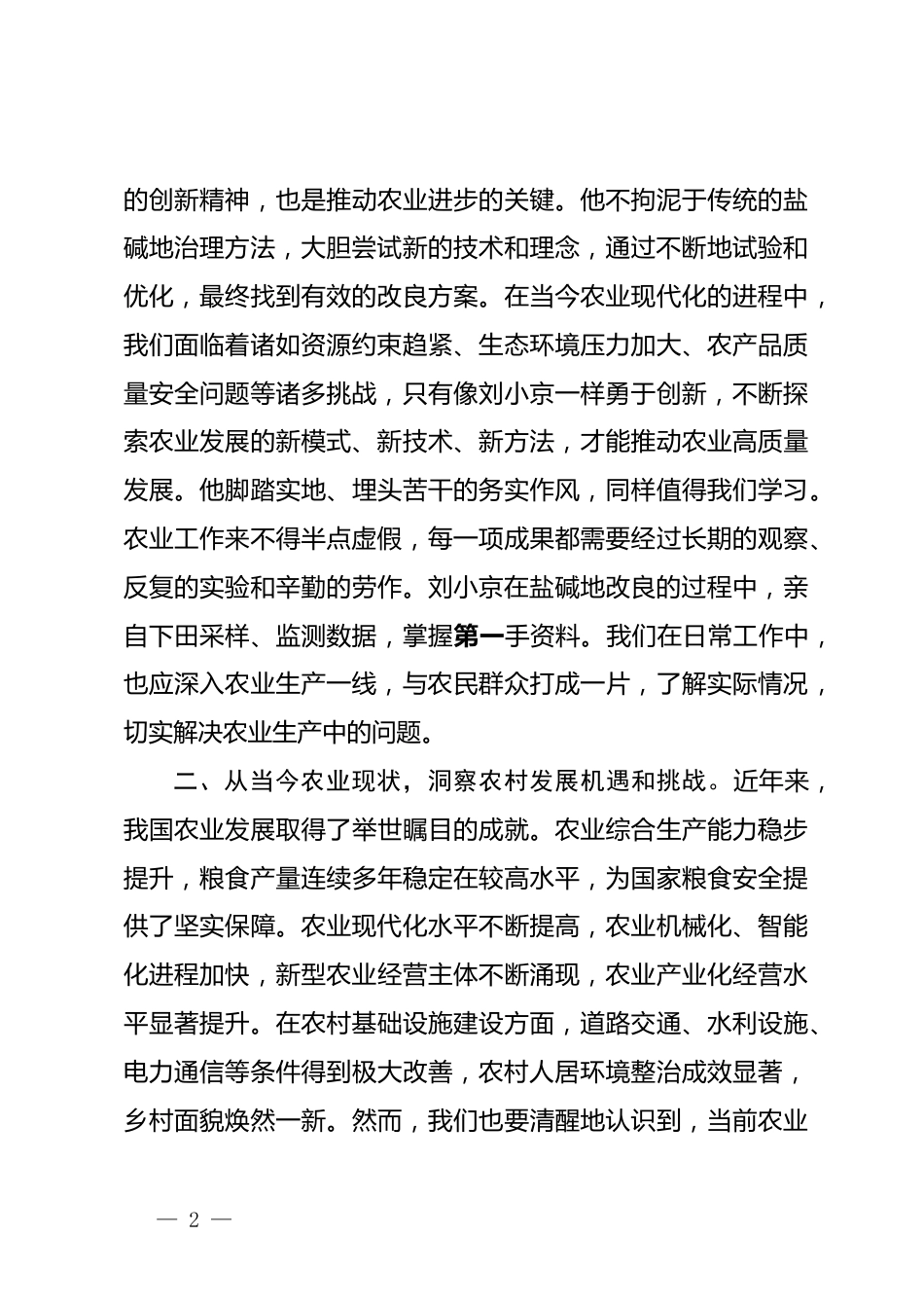農(nóng)業(yè)農(nóng)村局基層黨員觀看《榜樣9》心得體會(huì)《榜樣9》專(zhuān)題節(jié)目通過(guò)典型事跡展示、現(xiàn)場(chǎng)訪談、重溫入黨志愿書(shū)等形式,生動(dòng)展現(xiàn)了榜樣們學(xué)習(xí)踐行習(xí)近平新時(shí)代中國(guó)特色社會(huì)主義思想的突出事跡,彰顯了黨員們堅(jiān)定信念、踐行宗旨、改革創(chuàng)新、擔(dān)當(dāng)作為的高尚品質(zhì)和精神風(fēng)范。其中,農(nóng)業(yè)科學(xué)家劉小京的事跡深深觸動(dòng)了我,作為農(nóng)業(yè)農(nóng)村局的基層黨員,結(jié)合他的故事與農(nóng)業(yè)工作實(shí)際,我有了諸多深刻感悟。一、悟榜樣初心,汲取農(nóng)業(yè)奮進(jìn)精神力量。劉小京幾十年如一日,扎根農(nóng)業(yè)科研一線,將自己的青春與智慧無(wú)私奉獻(xiàn)給了農(nóng)業(yè)事業(yè)。他面對(duì)鹽堿地改良這一世界性難題,沒(méi)有絲毫退縮,憑借著...