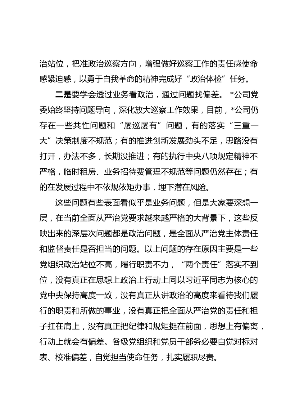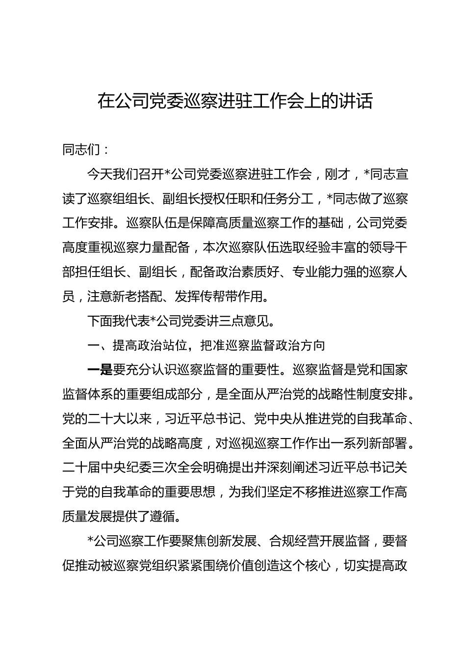 在公司黨委巡察進駐工作會上的講話同志們:今天我們召開*公司黨委巡察進駐工作會,剛才,*同志宣讀了巡察組組長、副組長授權(quán)任職和任務(wù)分工,*同志做了巡察工作安排。巡察隊伍是保障高質(zhì)量巡察工作的基礎(chǔ),公司黨委高度重視巡察力量配備,本次巡察隊伍選取經(jīng)驗豐富的領(lǐng)導(dǎo)干部擔(dān)任組長、副組長,配備政治素質(zhì)好、專業(yè)能力強的巡察人員,注意新老搭配、發(fā)揮傳幫帶作用。下面我代表*公司黨委講三點意見。一、提高政治站位,把準巡察監(jiān)督政治方向一是要充分認識巡察監(jiān)督的重要性。巡察監(jiān)督是黨和國家監(jiān)督體系的重要組成部分,是全面從嚴治黨的戰(zhàn)略性制度安排。黨的二十大以來...