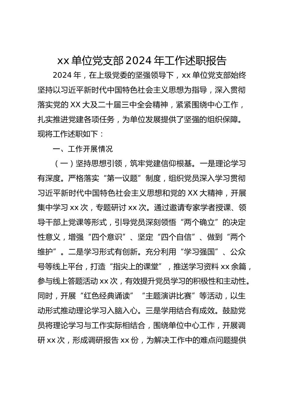 xx單位黨支部2024年工作述職報(bào)告2024年,在上級(jí)黨委的堅(jiān)強(qiáng)領(lǐng)導(dǎo)下,xx單位黨支部始終堅(jiān)持以習(xí)近平新時(shí)代中國(guó)特色社會(huì)主義思想為指導(dǎo),深入貫徹落實(shí)黨的XX大及二十屆三中全會(huì)精神,緊緊圍繞中心工作,扎實(shí)推進(jìn)黨建各項(xiàng)任務(wù),為單位發(fā)展提供了堅(jiān)強(qiáng)的組織保障。現(xiàn)將工作述職如下:一、工作開(kāi)展情況(一)堅(jiān)持思想引領(lǐng),筑牢黨建信仰根基。一是理論學(xué)習(xí)有深度。嚴(yán)格落實(shí)“第一議題”制度,組織黨員深入學(xué)習(xí)貫徹習(xí)近平新時(shí)代中國(guó)特色社會(huì)主義思想和黨的XX大精神,開(kāi)展集中學(xué)習(xí)xx次,專題研討xx次。通過(guò)邀請(qǐng)專家學(xué)者授課、領(lǐng)導(dǎo)干部上黨課等形式,引導(dǎo)黨員深刻領(lǐng)悟“兩個(gè)確立”的...