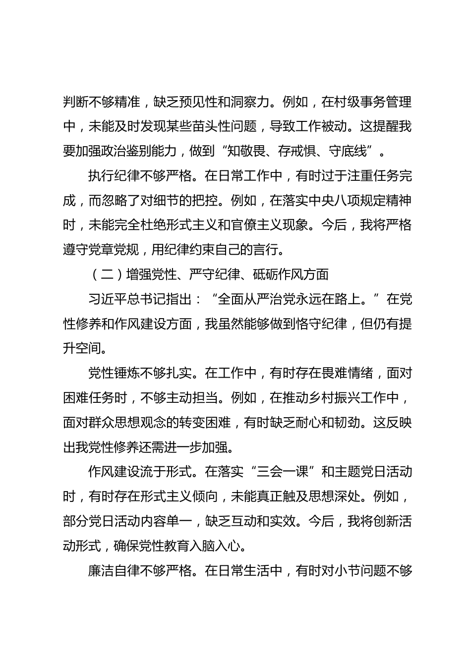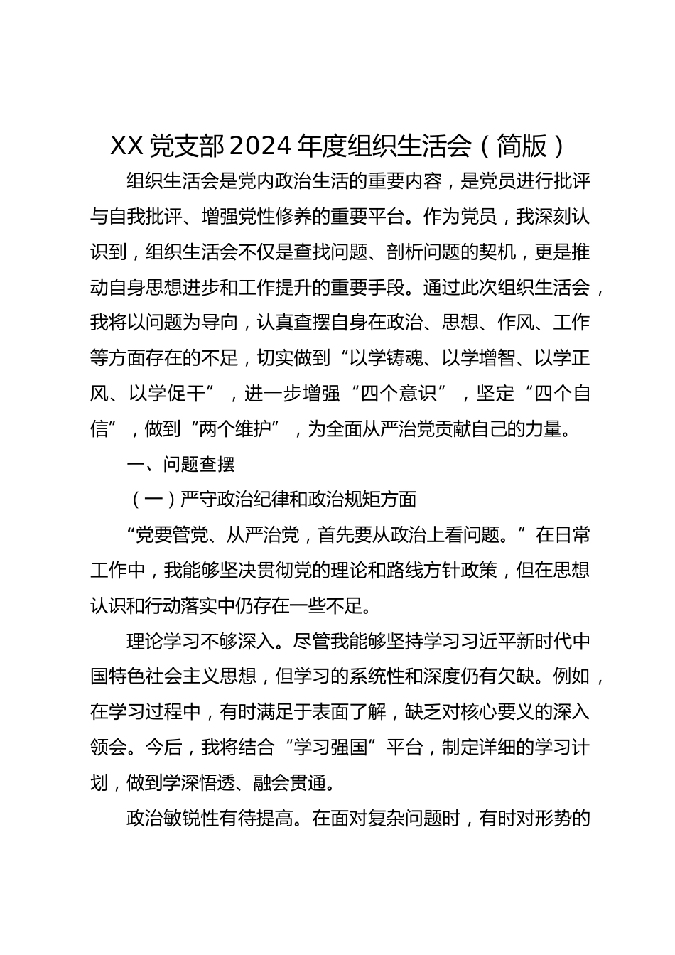 XX黨支部2024年度組織生活會(huì)(簡(jiǎn)版)組織生活會(huì)是黨內(nèi)政治生活的重要內(nèi)容,是黨員進(jìn)行批評(píng)與自我批評(píng)、增強(qiáng)黨性修養(yǎng)的重要平臺(tái)。作為黨員,我深刻認(rèn)識(shí)到,組織生活會(huì)不僅是查找問(wèn)題、剖析問(wèn)題的契機(jī),更是推動(dòng)自身思想進(jìn)步和工作提升的重要手段。通過(guò)此次組織生活會(huì),我將以問(wèn)題為導(dǎo)向,認(rèn)真查擺自身在政治、思想、作風(fēng)、工作等方面存在的不足,切實(shí)做到“以學(xué)鑄魂、以學(xué)增智、以學(xué)正風(fēng)、以學(xué)促干”,進(jìn)一步增強(qiáng)“四個(gè)意識(shí)”,堅(jiān)定“四個(gè)自信”,做到“兩個(gè)維護(hù)”,為全面從嚴(yán)治黨貢獻(xiàn)自己的力量。一、問(wèn)題查擺(一)嚴(yán)守政治紀(jì)律和政治規(guī)矩方面“黨要管黨、從嚴(yán)治黨,首...