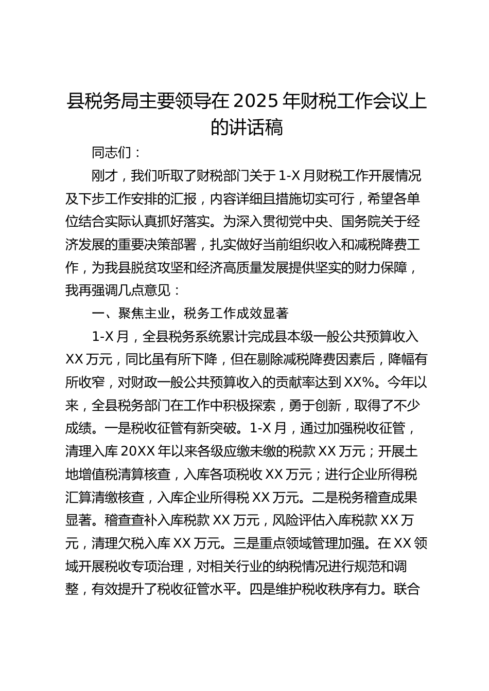縣稅務(wù)局主要領(lǐng)導在2025年財稅工作會議上的講話稿同志們:剛才,我們聽取了財稅部門關(guān)于1-X月財稅工作開展情況及下步工作安排的匯報,內(nèi)容詳細且措施切實可行,希望各單位結(jié)合實際認真抓好落實。為深入貫徹黨中央、國務(wù)院關(guān)于經(jīng)濟發(fā)展的重要決策部署,扎實做好當前組織收入和減稅降費工作,為我縣脫貧攻堅和經(jīng)濟高質(zhì)量發(fā)展提供堅實的財力保障,我再強調(diào)幾點意見:一、聚焦主業(yè),稅務(wù)工作成效顯著1-X月,全縣稅務(wù)系統(tǒng)累計完成縣本級一般公共預算收入XX萬元,同比雖有所下降,但在剔除減稅降費因素后,降幅有所收窄,對財政一般公共預算收入的貢獻率達到XX%。今年以來,全...